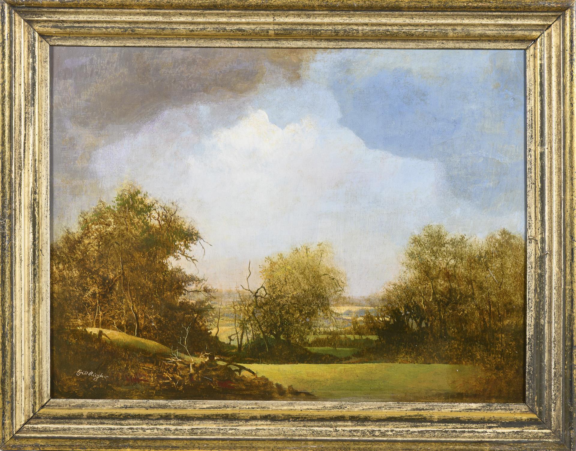 Hügelige Gegend mit vereinzelten Wäldchen unter gewittrigem Wolkenhimmel. Leichte Altersspuren.