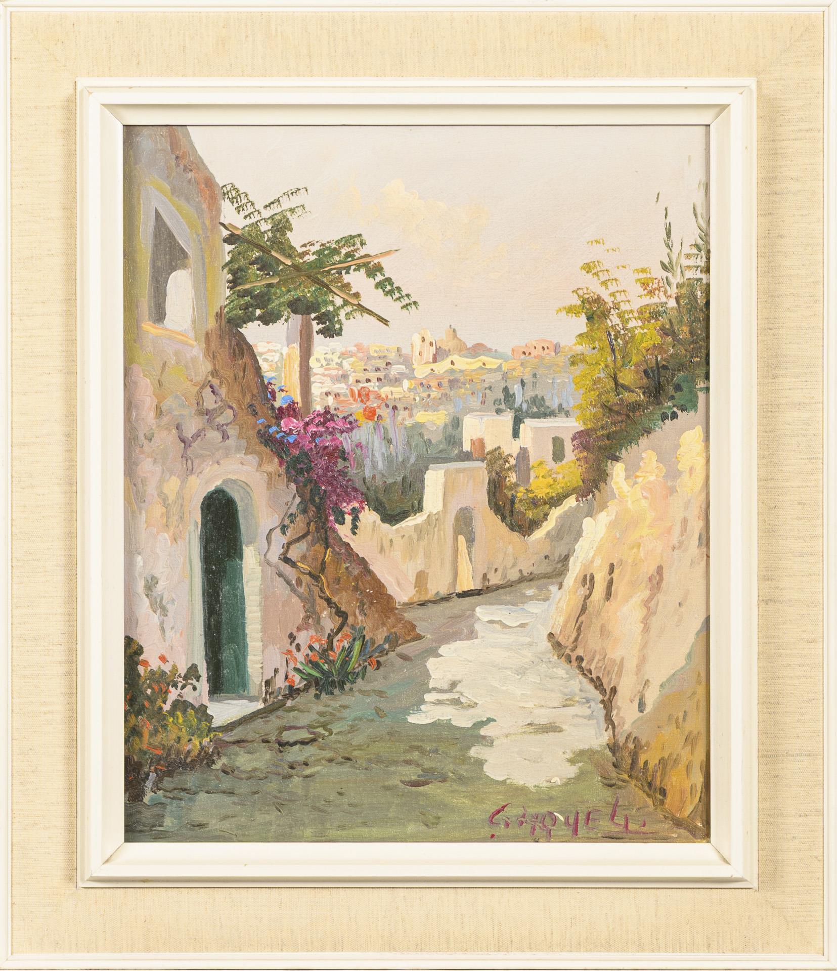 Schmale Gasse mit Blick über die große Stadt im Sonnenschein.