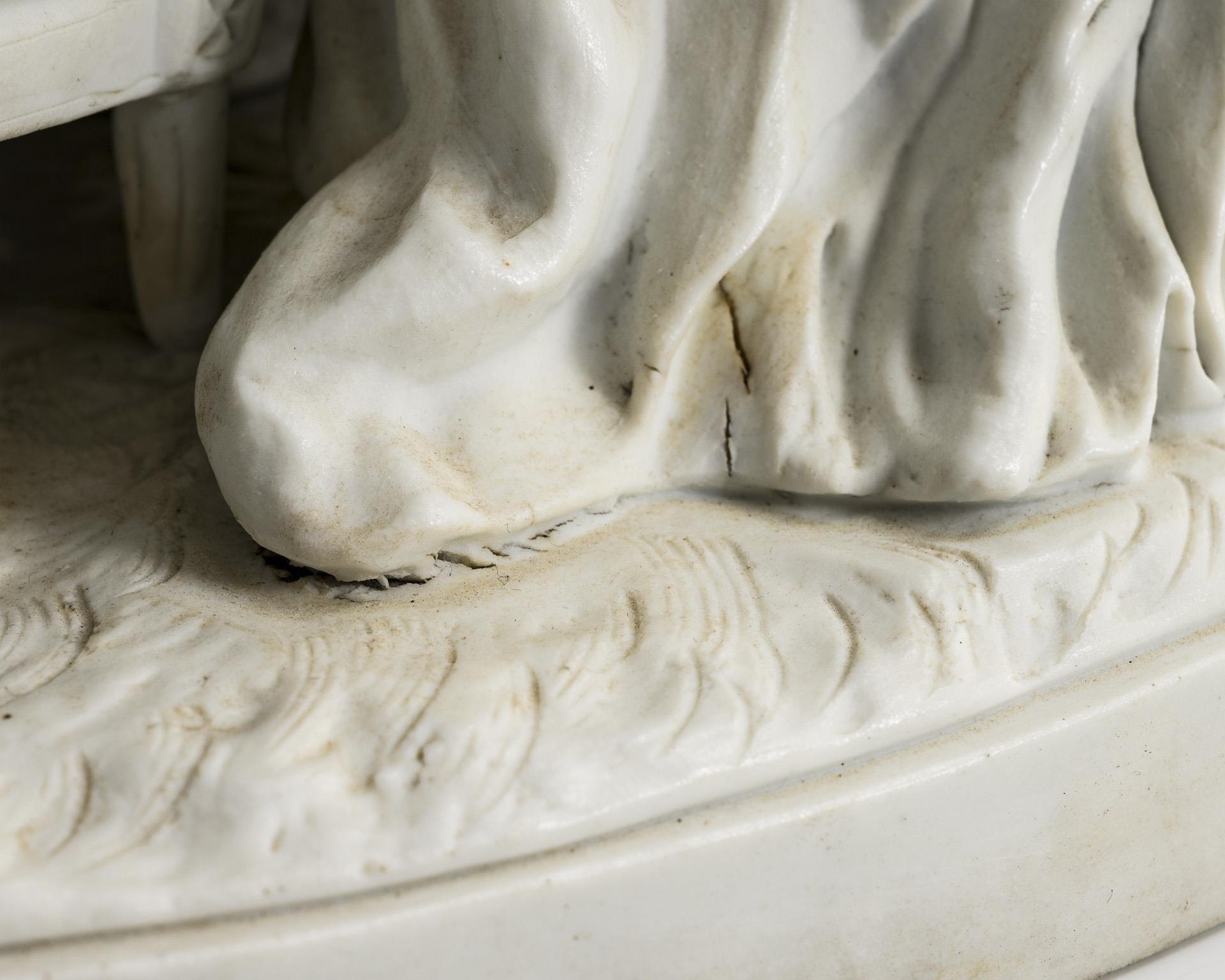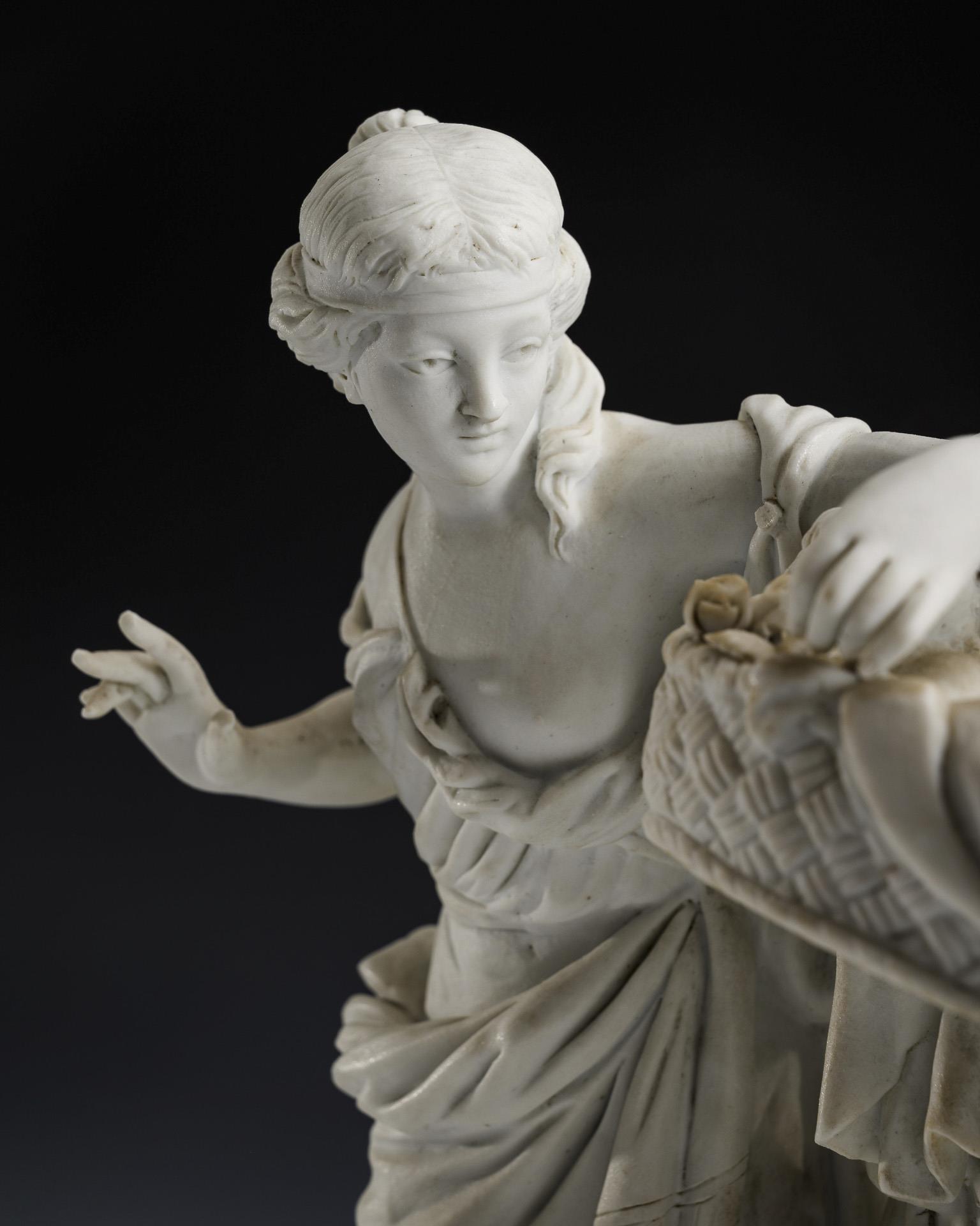 Gruppe dreier antiker Damen mit Rosenkörben und teils in den Körben liegenden Amorknaben. 2 kleine Fehlstehlen auf dem Sockel.