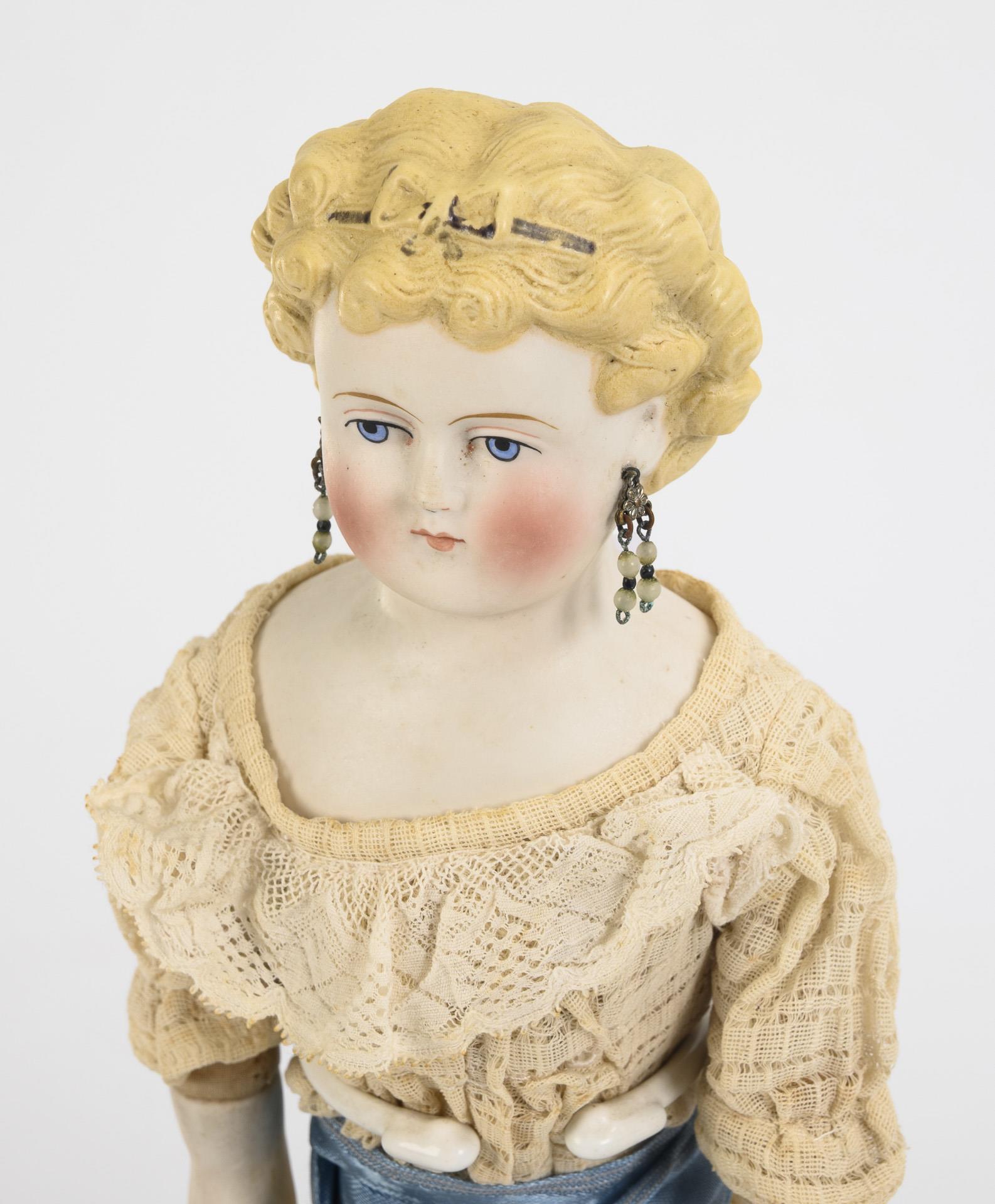 Brustkopf aus Biskuitporzellan, gemalte blaue Augen, modellierte blonde Haare, Ohrringe. Stoffkörper mit Biskuitgliedern, modellierte blaue Stiefelchen, weißes Kleid mit blauer Schleife. Daumen links geklebt.