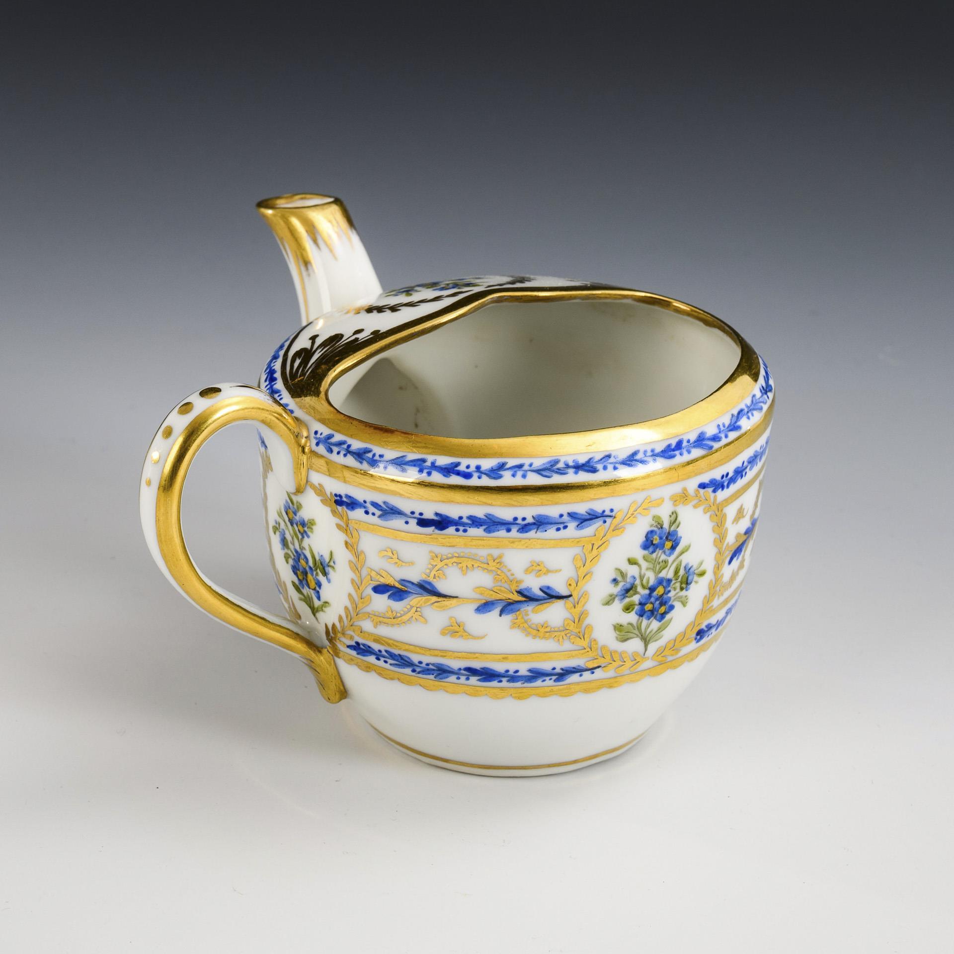 Mit kleinen Vergißmeinnichtbuketts in goldgerahmten Medaillons sowie blauen und goldenen, stilisierten Blattranken. Wohl Gesellenstück. Kleiner, geklebter und goldretuschierter Ausbruch an der Schneppe.