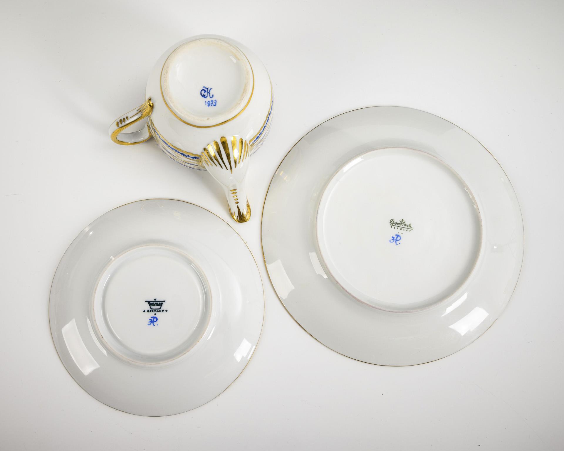 Polychrom bemalt, goldstaffiert. Schnabeltasse (H 8 cm), Untertasse (Ø 15,5cm) und Teller (Ø 19,5 cm).