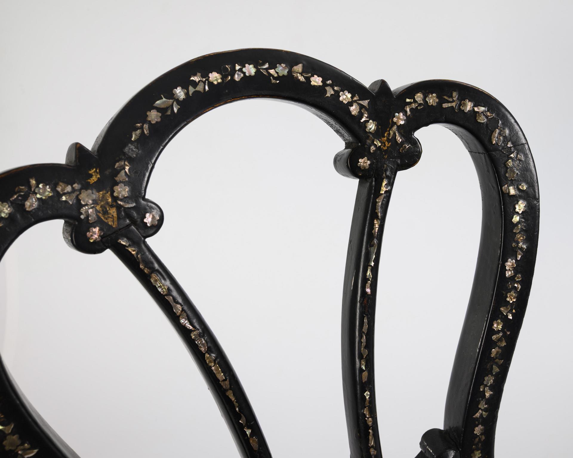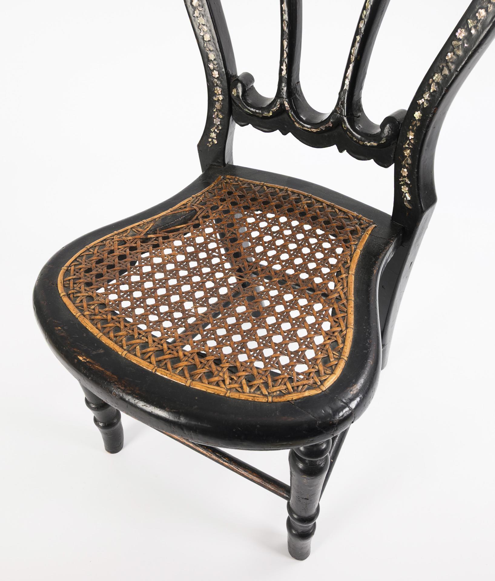 Dekorativer Stuhl mit Perlmutt-Einlagen an der Rückenlehne, geflochtener Sitzfläche und gedrechselten Vorderbeinen. Sitzfläche mit kleinem Defekt.