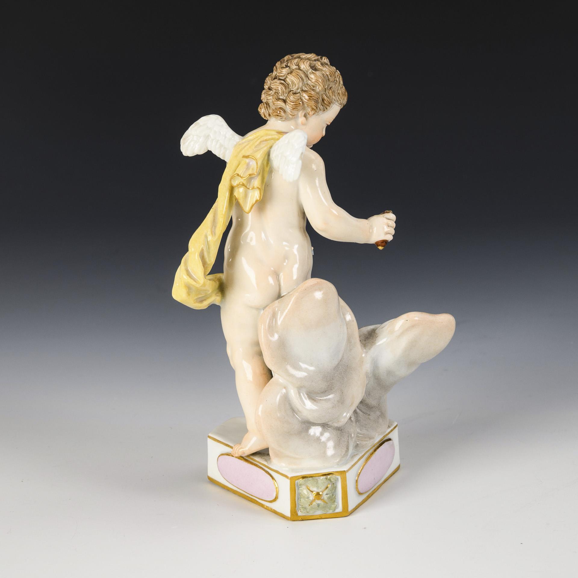 An einer Wolke stehender Putto mit einem Herz am Band. Band defekt, Gegenstand in der rechten Hand fehlt.