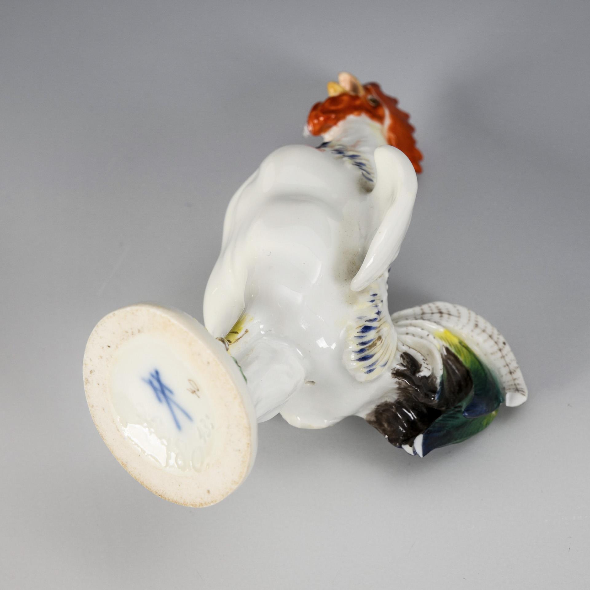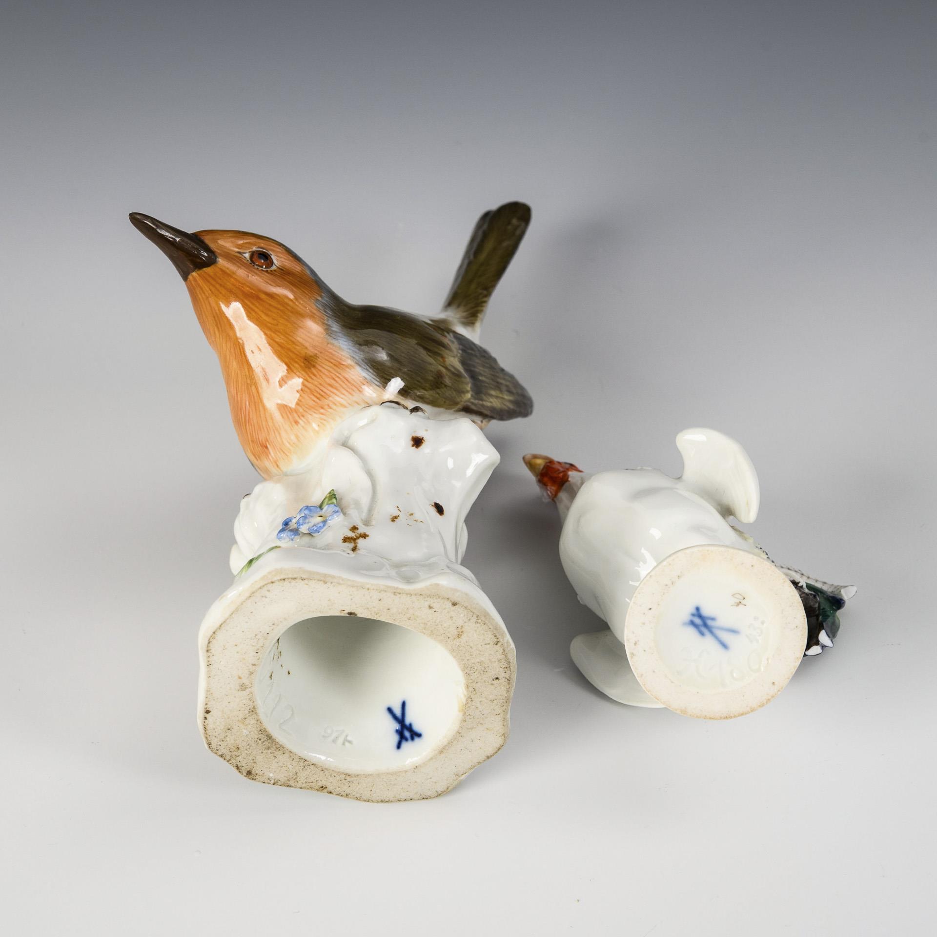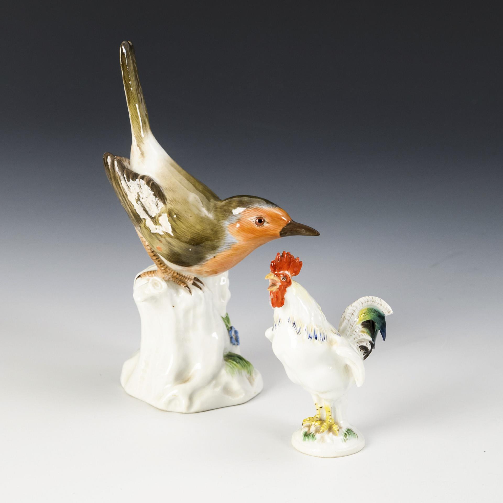 1x Modell-Nr. J 112; Entwurf 1863 von August Ringler (1837-1918): auf einem Baumstamm sitzendes Rotkehlchen. / 1x Modell-Nr. X 180, Entwurf 1907 von Max Bochmann (1874-1942): krähender Hahn. 1 Schnabel restauriert, 3 Schwanzfedern des Hahnes bestoßen.
