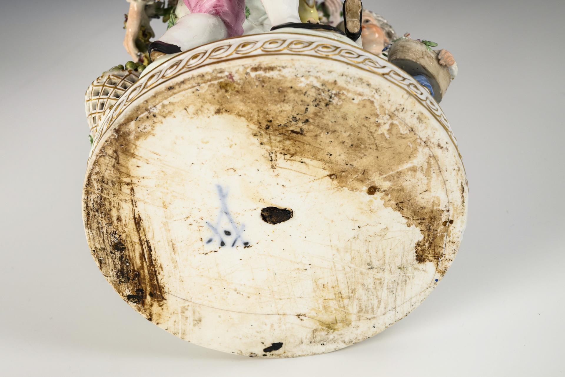 Eine auf einem Felspostament stehende Vase mit einer Blumengirlande schmückendes Gärtnerpaar, am Fuß des Sockels ein Gärtnerknabe mit Blumenkorb sitzend. Vasendeckel fehlt, Bestoßungen an den Blüten, 1 Ecke des Gehrocks und Vasenrand bestoßen.