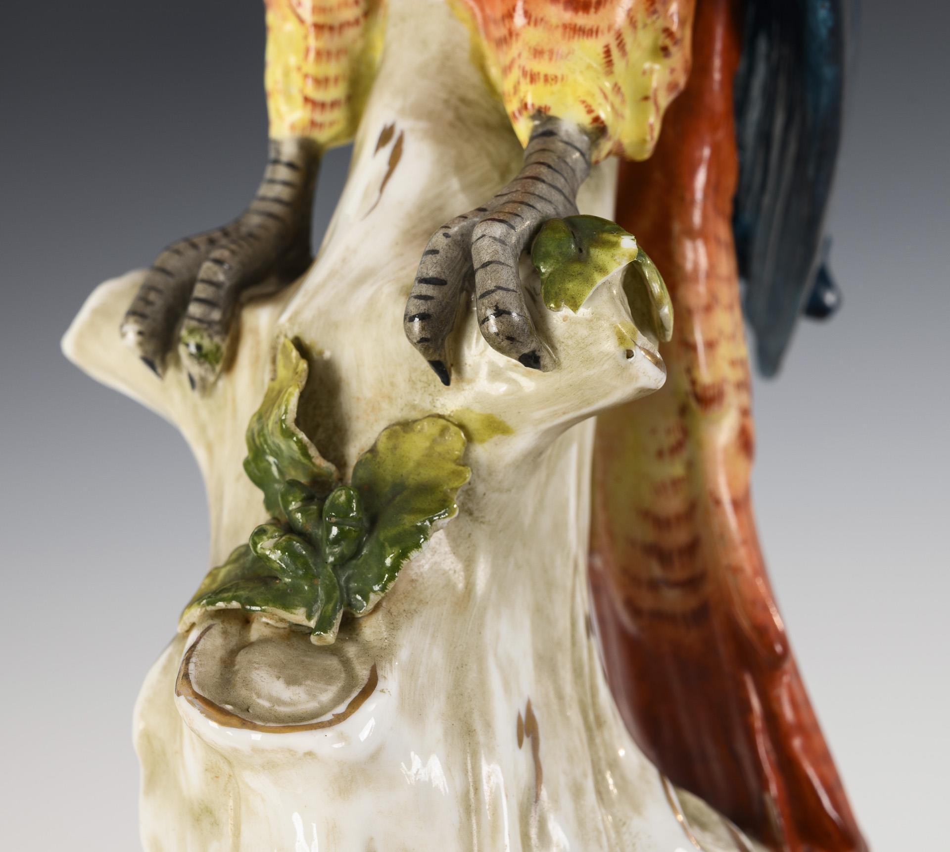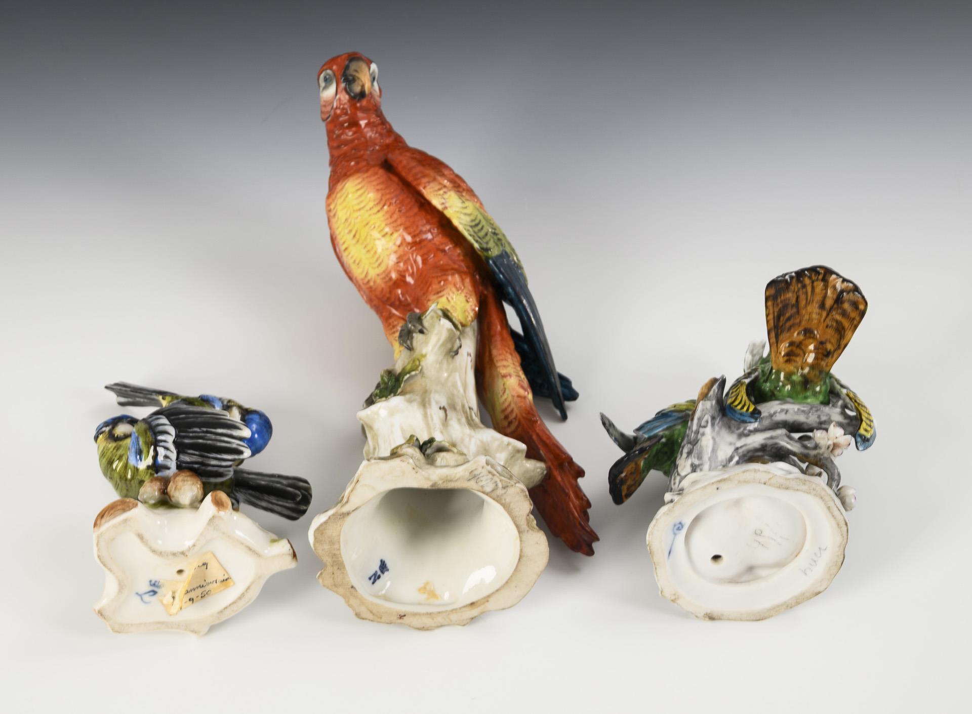 1x Neapelmarke: auf einem Baumstamm sitzender Papagei (H 27,5 cm). / 2x PASSAU, verschiedene Marken: Blaumeisenpaar mit Zapfen (H 15,5 cm) und Vogelpaar an Nest (H 14,5 cm). 1 Blatt am Stamm des Papageis bestoßen, 1 Flügelspitze und 1 Blütenblatt bestoßen, Bestoßung an 1 Sockelrand.