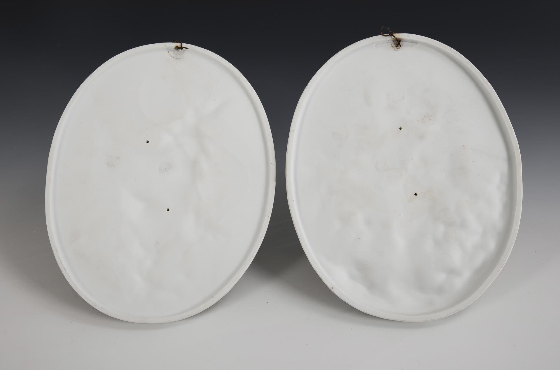 Ovale Reliefs, 1x mit der Darstellung eines laufenden Paares und 1x mit der Darstellung einer jungen Frau. 1 Fußspitze, 1 Tuchzipfel und 1 Blatt bestoßen.