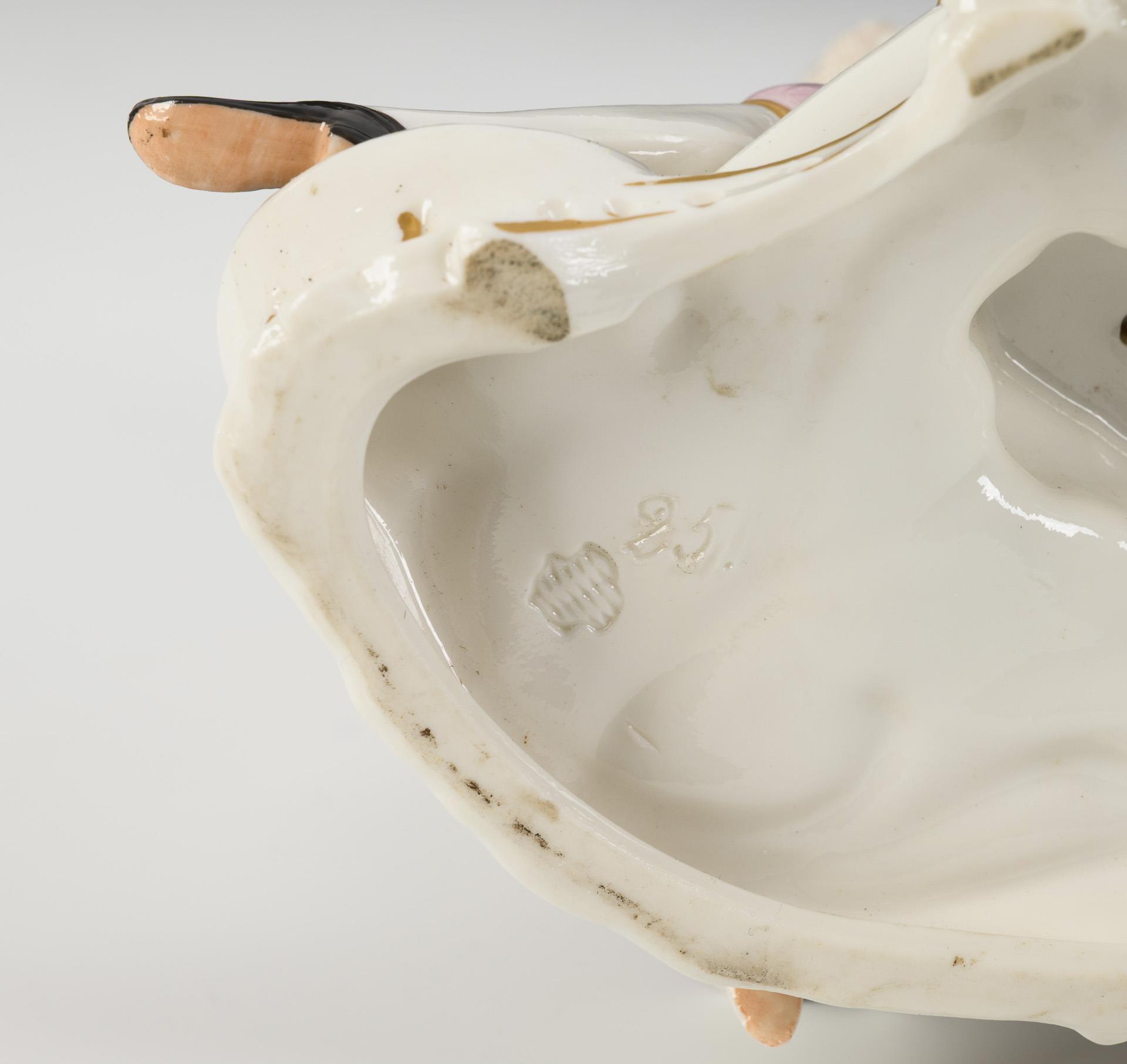 Auf einem Rocaillesockel liegender, schlafender Rokokoherr, der von zwei Damen geneckt wird. Pflanze in der Hand einer Dame bestoßen.