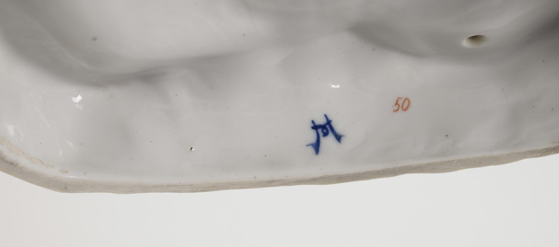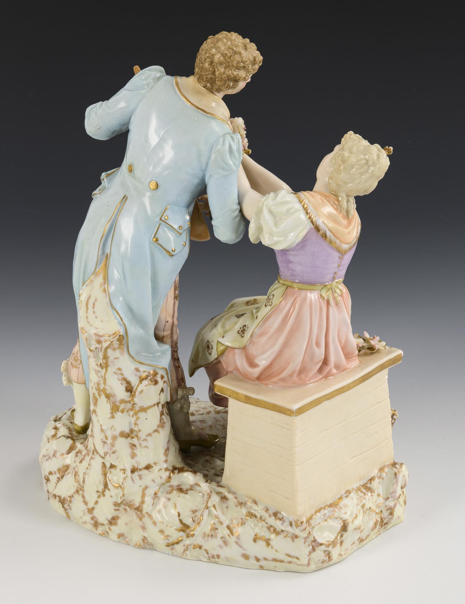 Auf einer Steinbank sitzende junge Frau mit zwei Blumensträußchen sowie ein sich zu ihr beugender, eine Mandoline spielender Kavalier. Mandolinenkopf fehlt, Mandolinenhals und linke Hand des Kavaliers restauriert, Blüten partiell bestoßen.