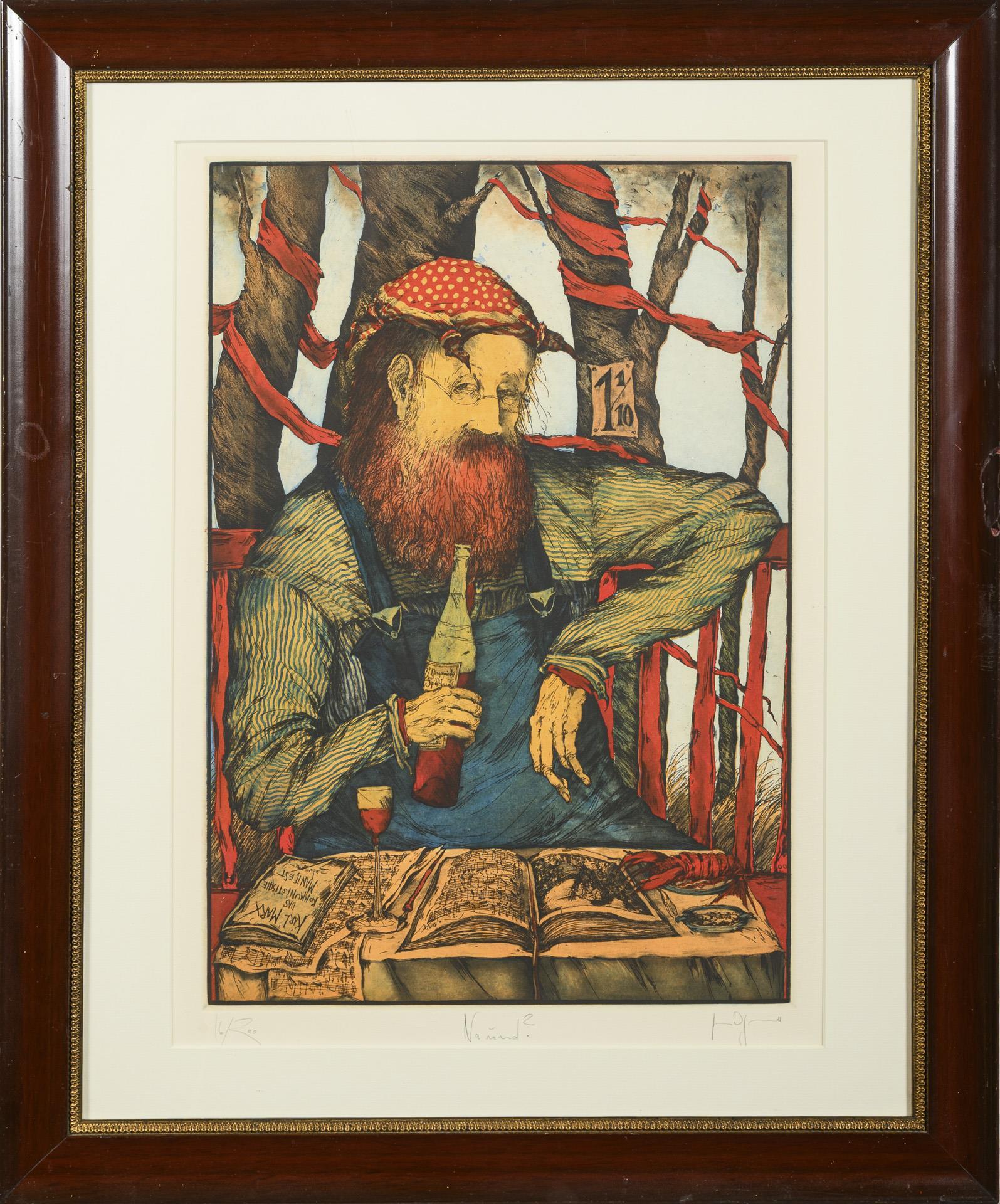 Nummeriertes Blatt 16/200. Rotwein trinkender Alter mit Noten und dem kommunistischen Manifest.