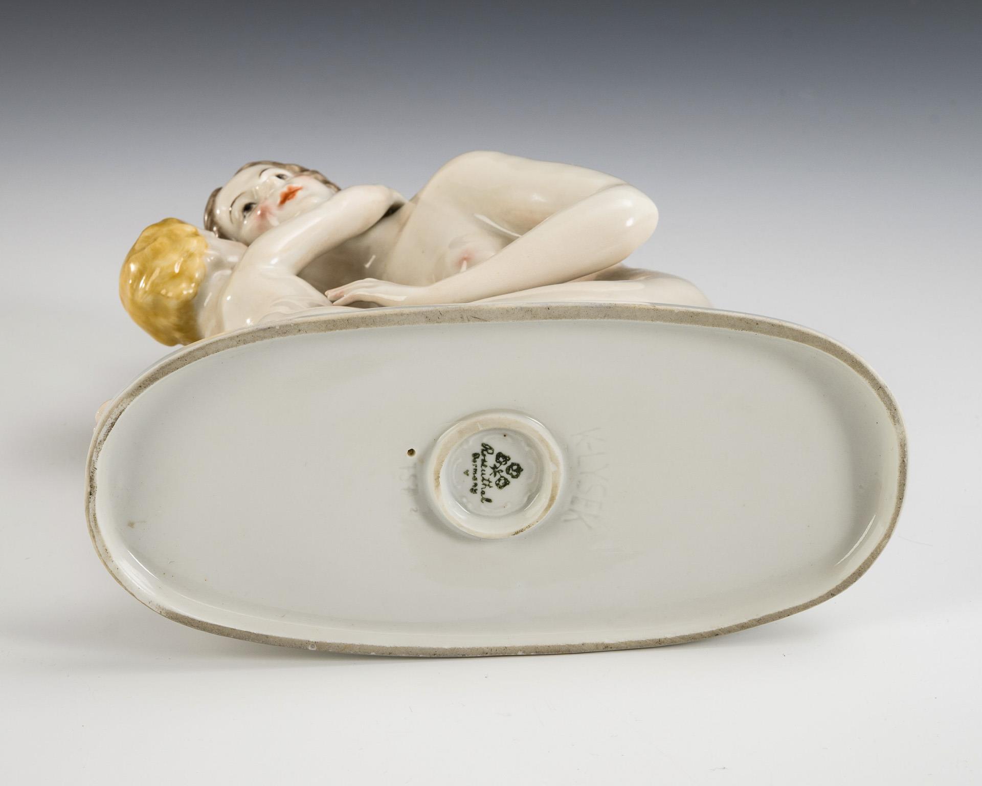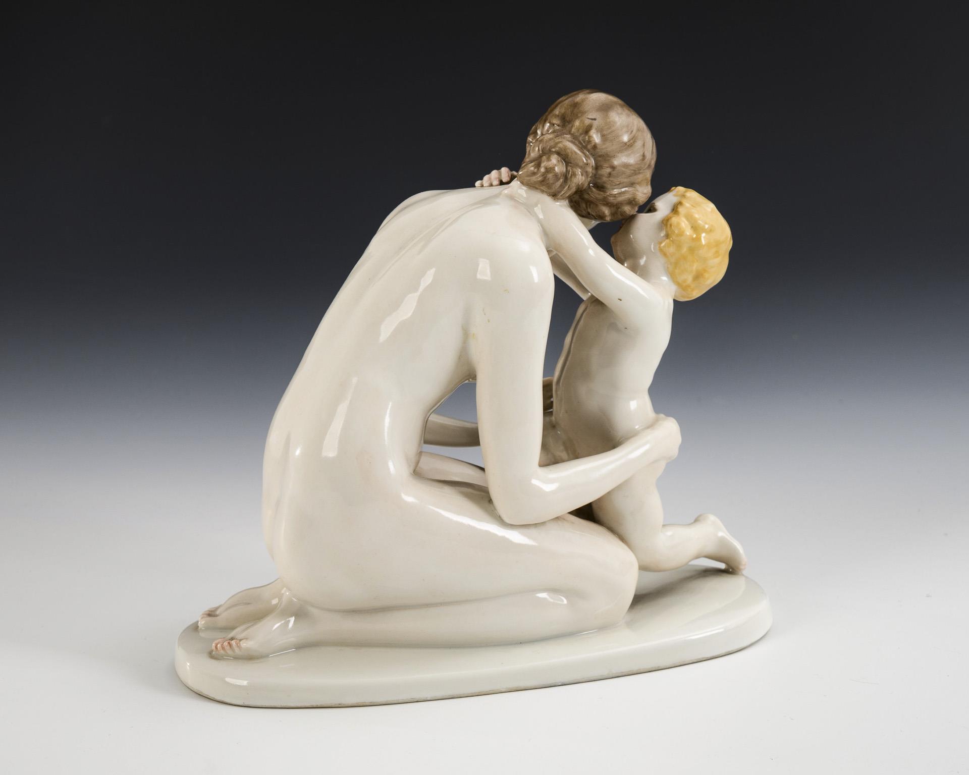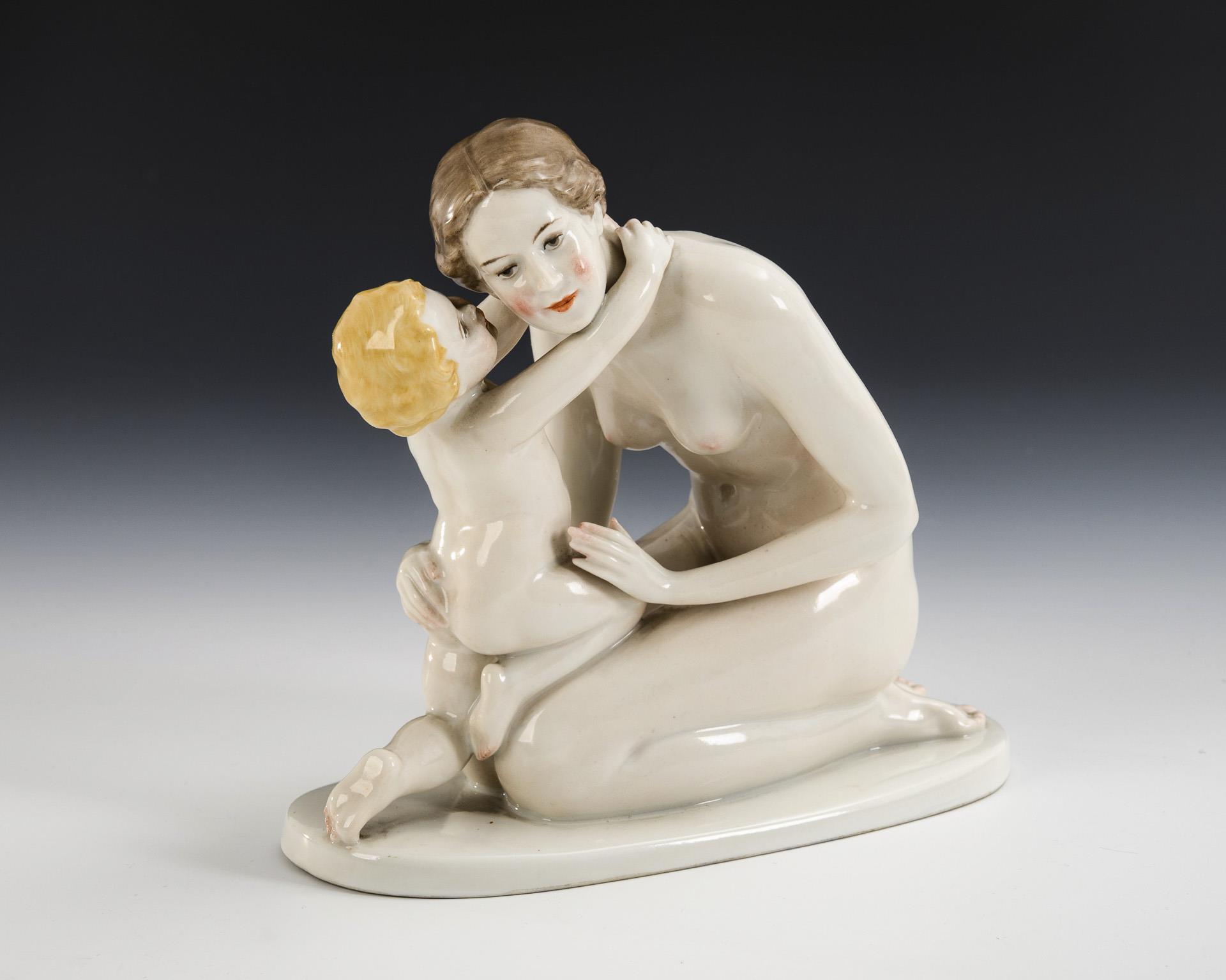 Auf einer Ovalplinthe kniende nackte junge Frau mit ihrem sie umarmenden, ihr ins Ohr flüsternden Kind.