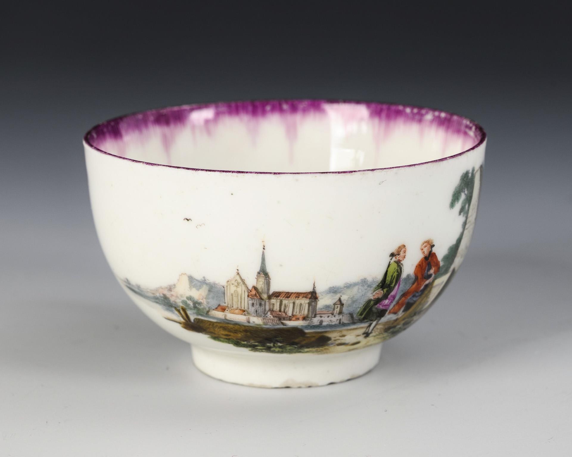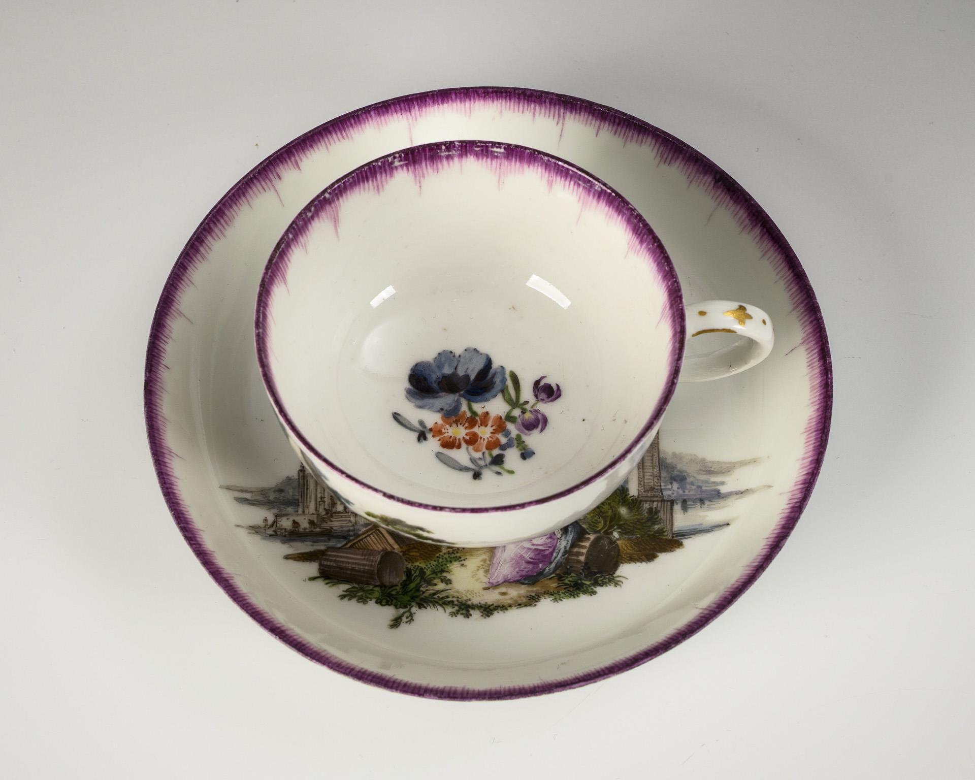 Bauchige Tasse mit Ohrenhenkel. Schauseitig sowie im Spiegel der Untertasse eine fein gemalte Landschaft mit Architektur und galanten Paaren. Standring der Tasse etwas bestoßen, Purpurrand der Tasse etwas berieben.