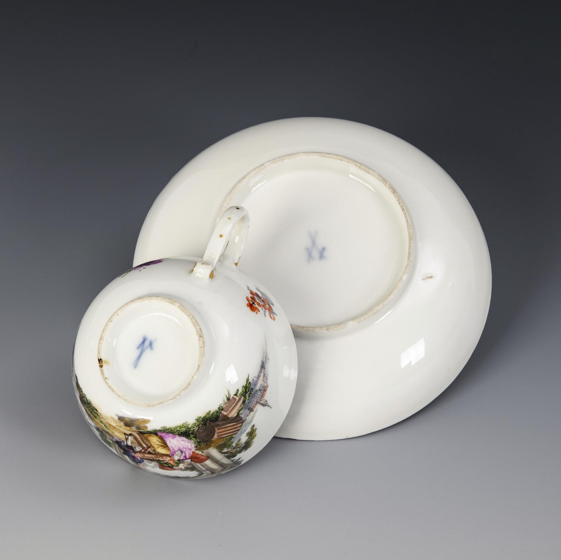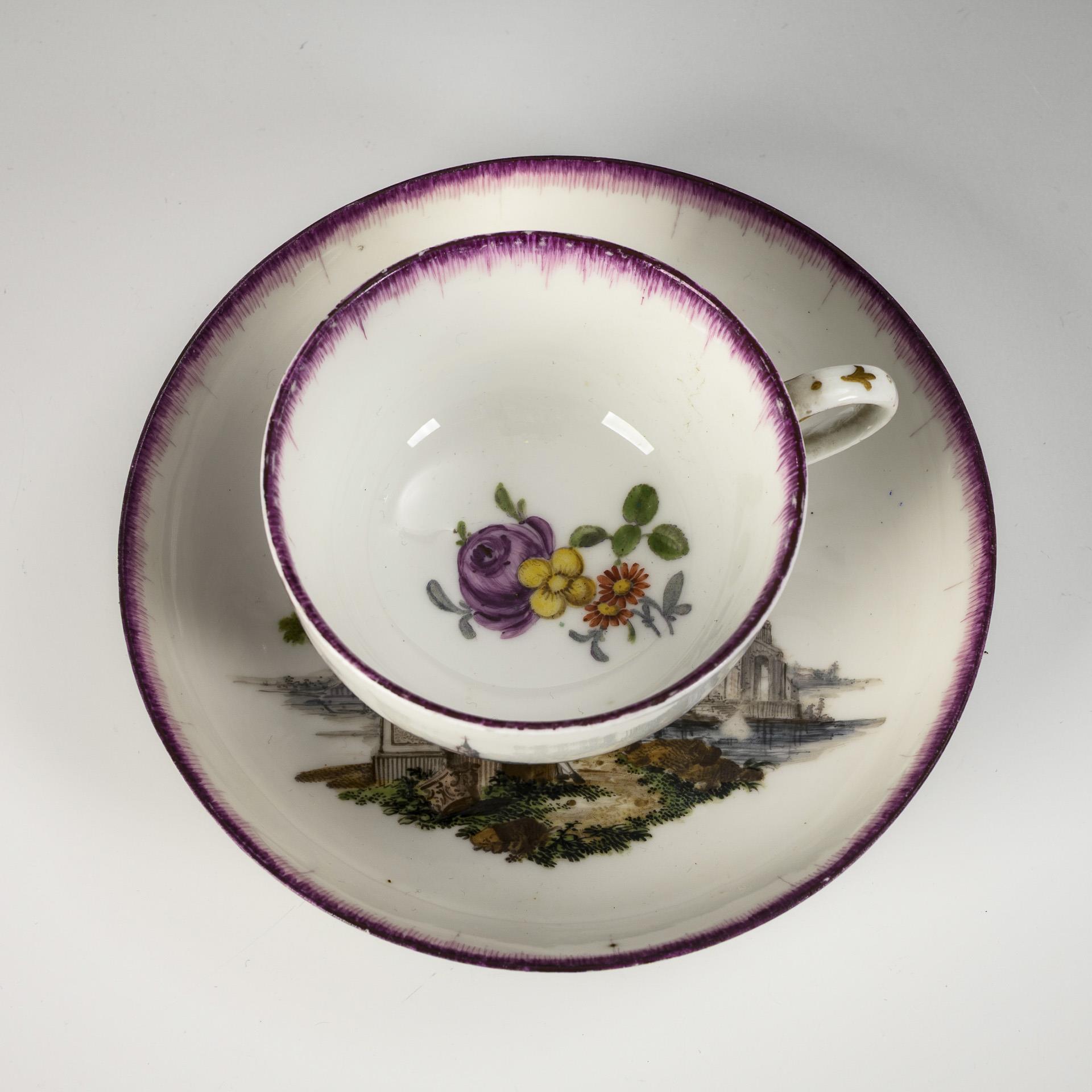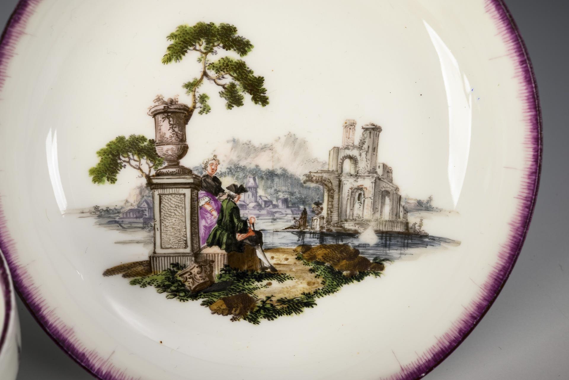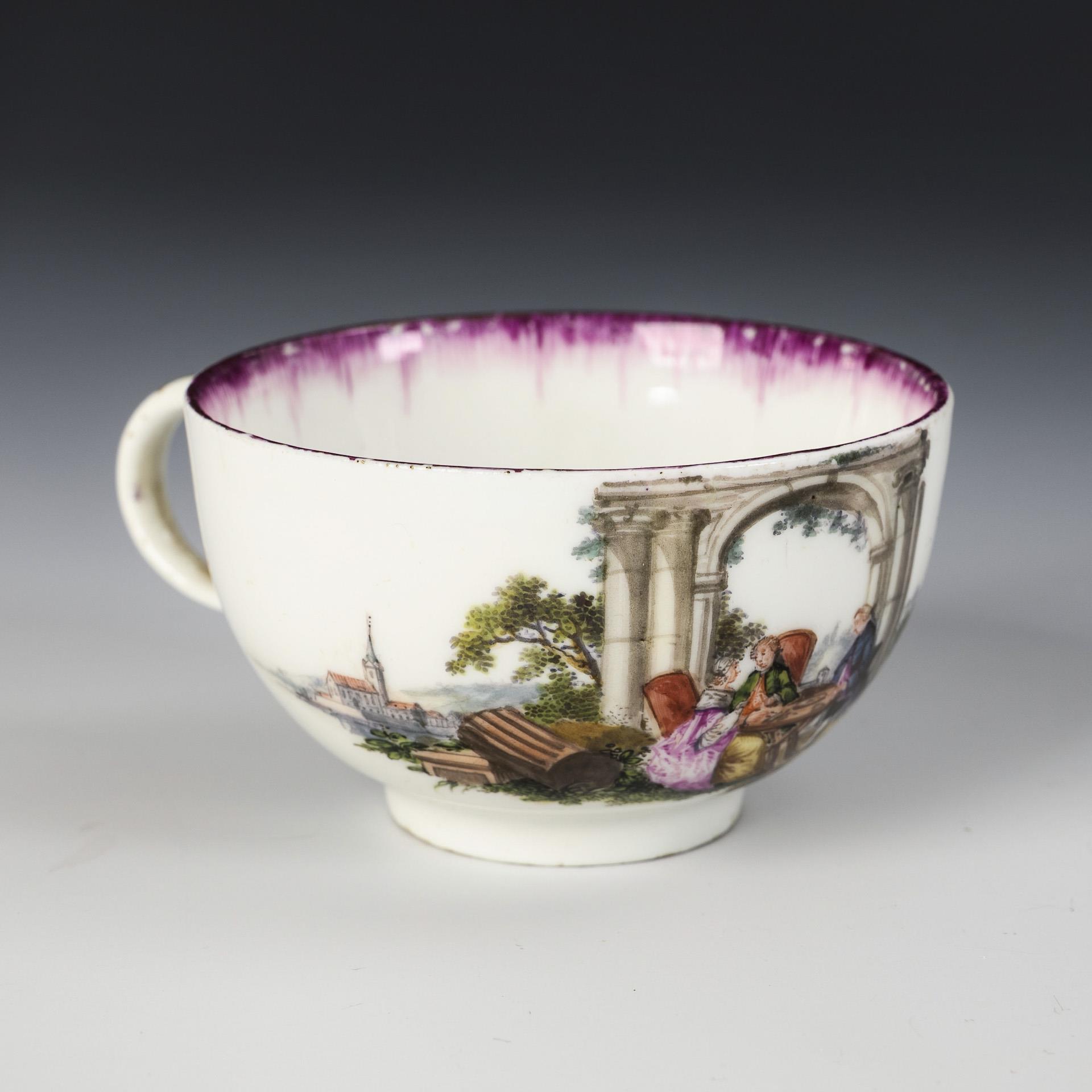 Bauchige Tasse mit Ohrenhenkel. Schauseitig sowie im Spiegel der Untertasse eine fein gemalte Landschaft mit Architektur und einem galanten Paar. Purpur des Tassenrandes etwas berieben.