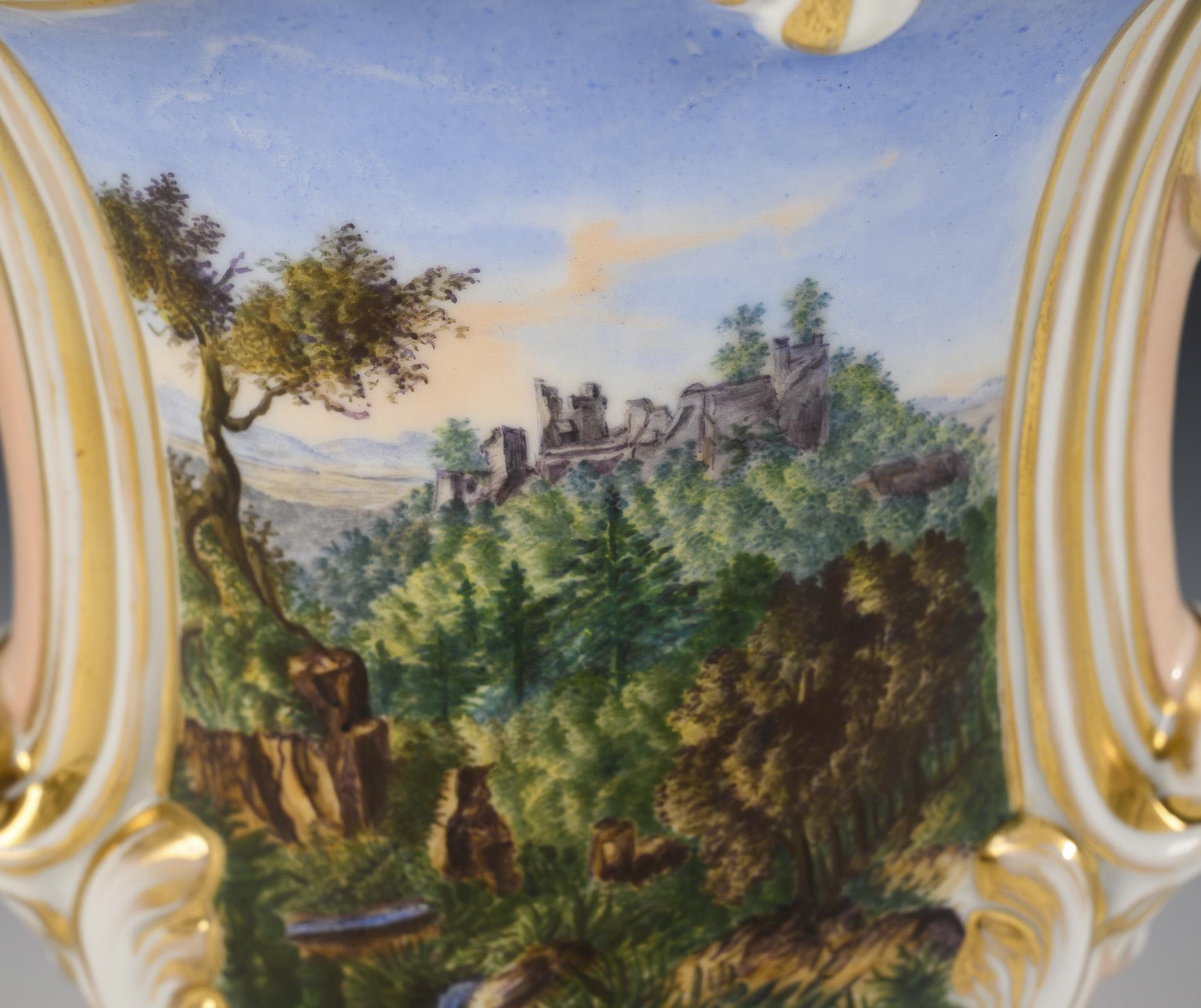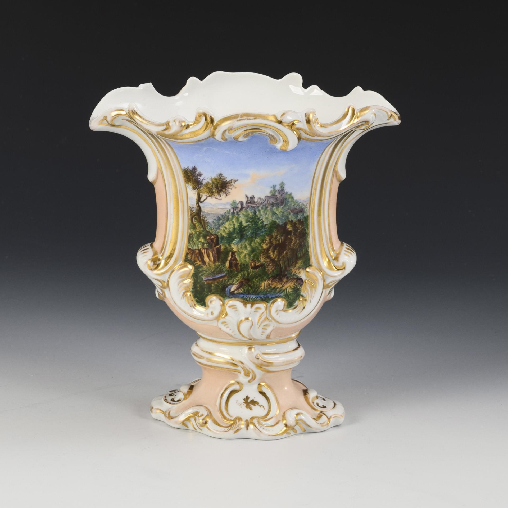 Kraterplattvase mit Rocaillerelief und Fuß. Lachsfarbener Fond, in zwei Kartuschen die Ansicht einer Burgruine und die Ansicht eines Tores. Bestoßung am Mündungsrand, Gold etwas berieben.