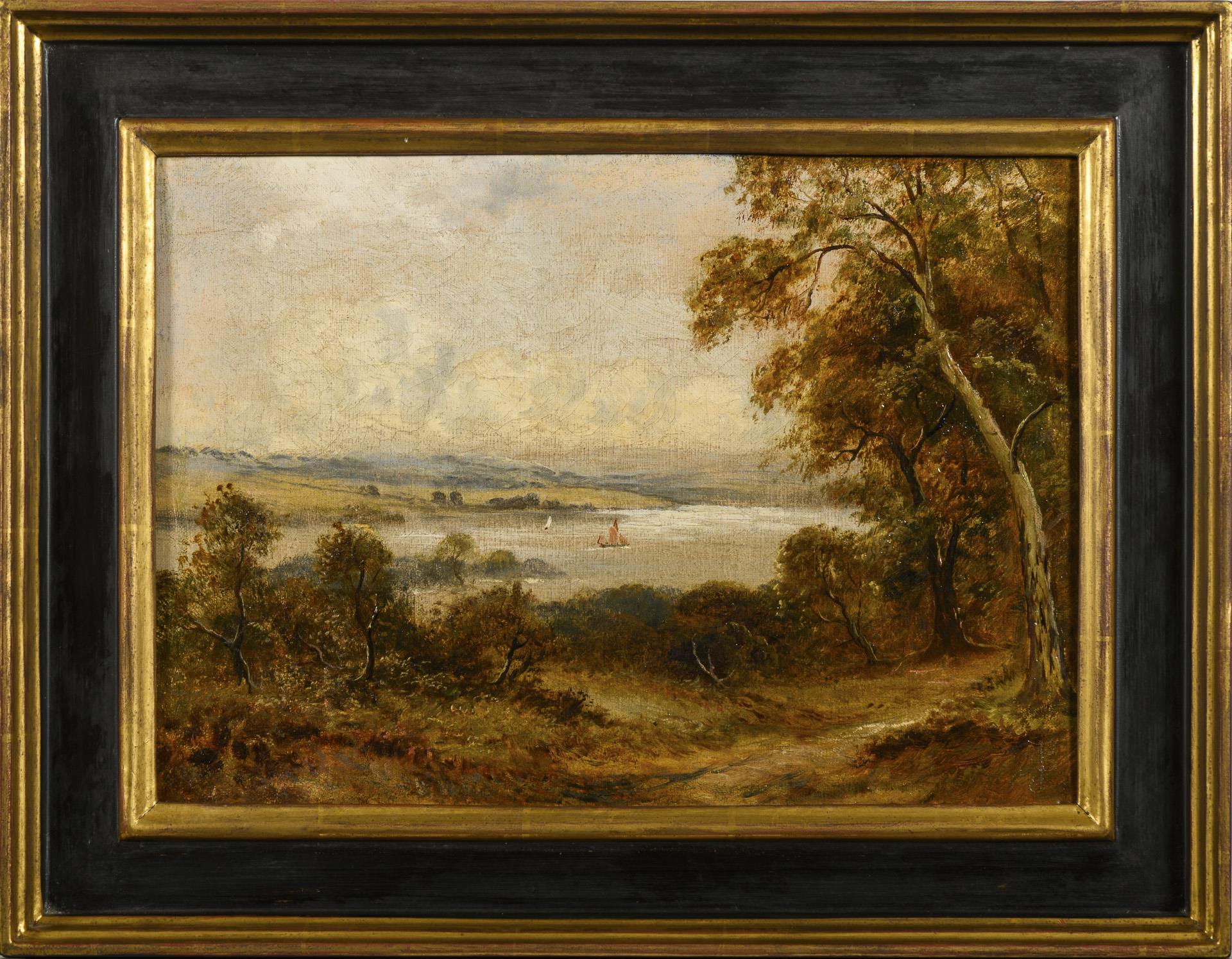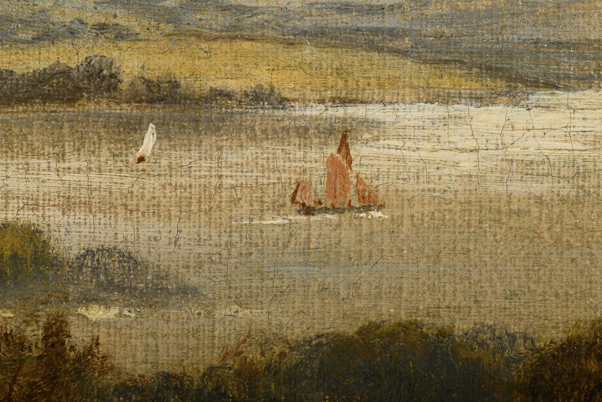 Blick vom Waldrand zum Fluss mit den Seglern unter weitem Wolkenhimmel. Leichte Altersspuren.