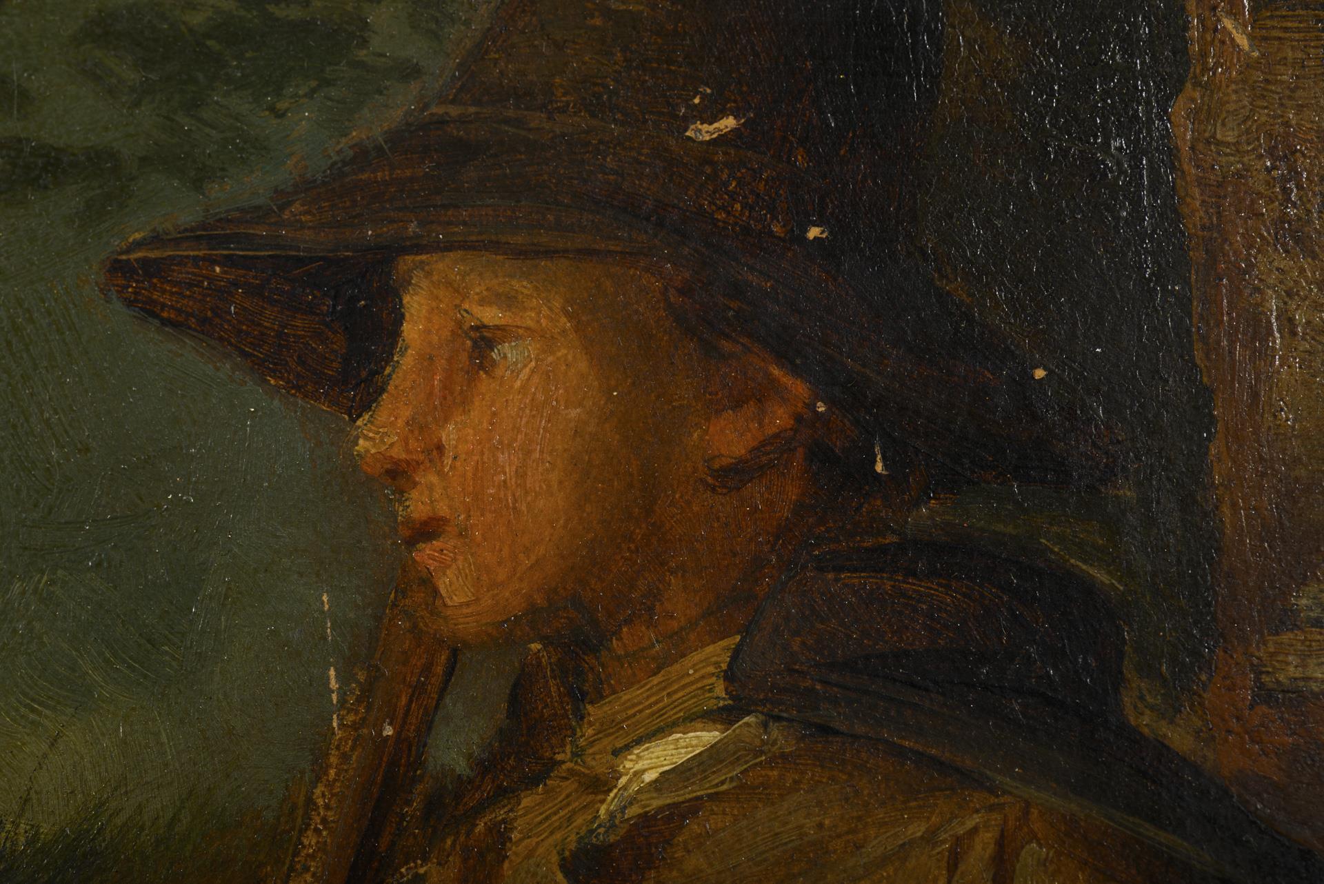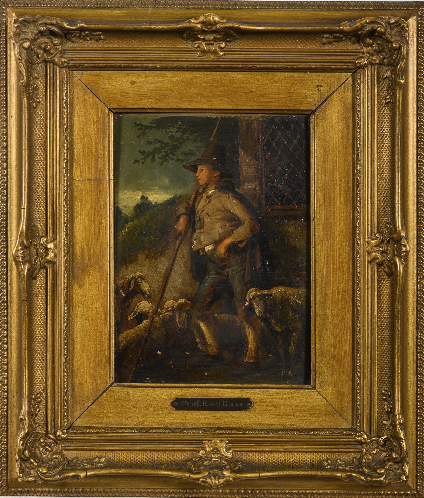 Der Knabe mit den Schafen an einem Haus in bergiger Landschaft. Altersspuren.
