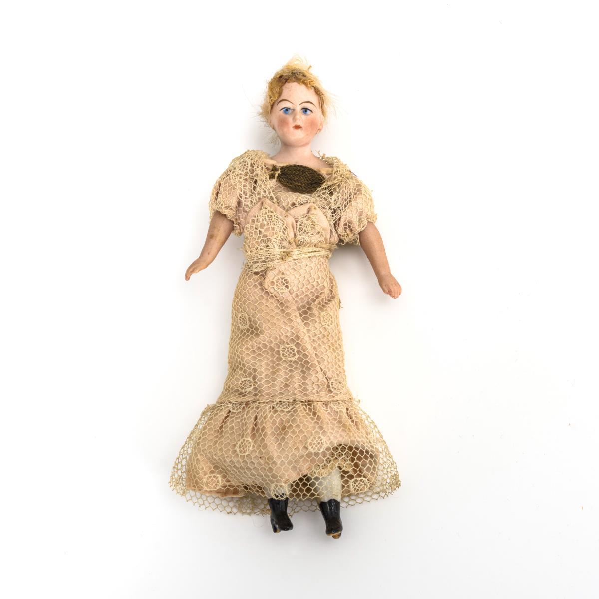 Puppendame mit Brustkopf, Stoffkörper und Porzellangliedern. Originalbekleidet.