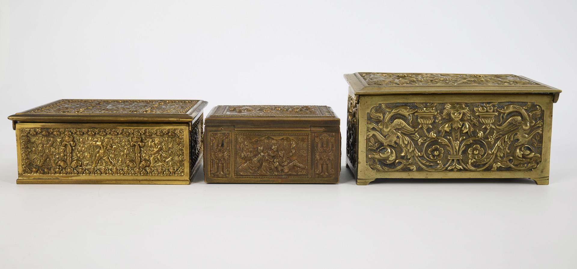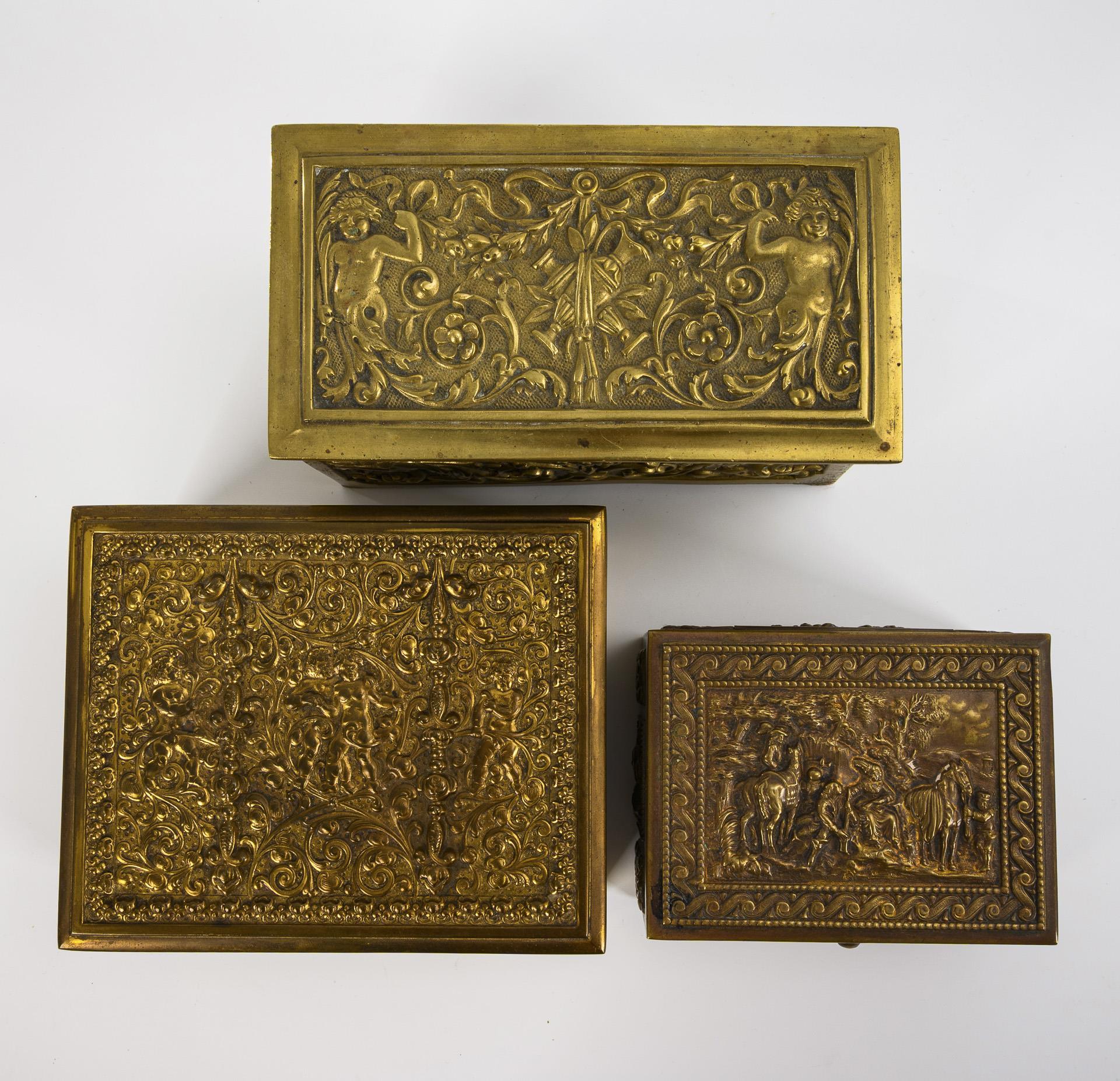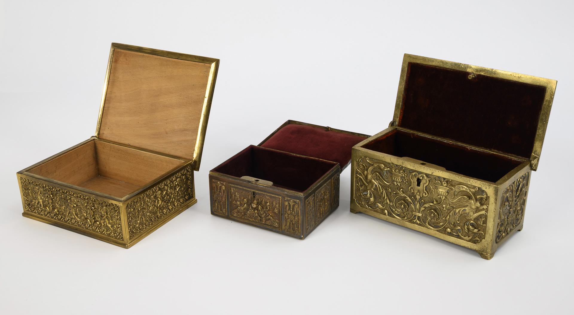 Allseits reich reliefierte Flachdeckeltruhen mit floralen Motiven und Putti sowie figürlichen Motiven. Ein ergänzter Schlüssel. Zwei Truhen im Inneren mit rotem Samt ausgekleidet, eine Truhe nicht ausgekleidet. Alters- und Gebrauchsspuren, Kleine Schatulle restvergoldet.