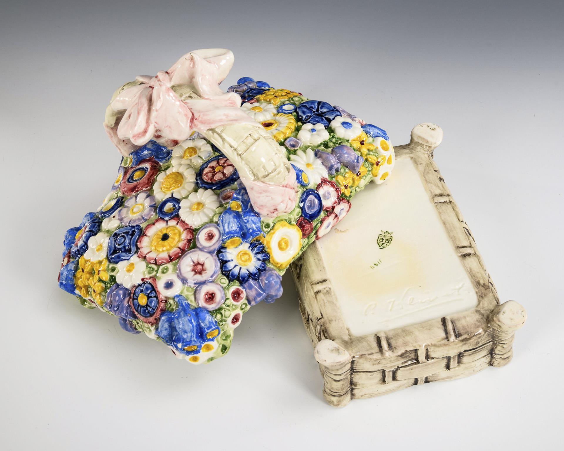 Rechteckdose mit korbartigem Unterteil und blumenreliefiertem Deckel mit schleifenverziertem Henkel. Mit Bestoßungen.