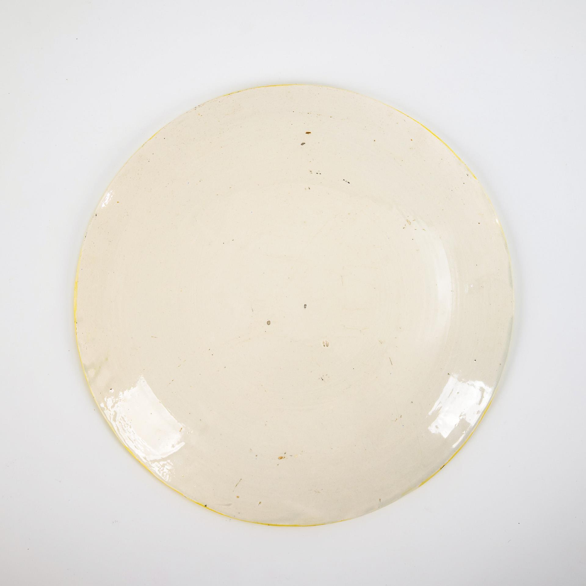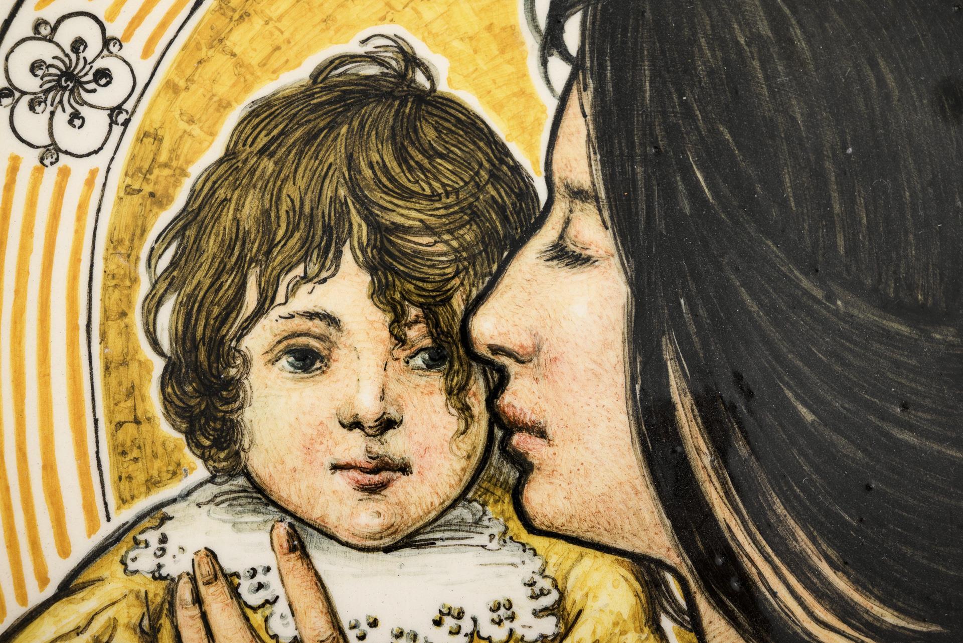 Runder Teller mit einer liebevollen Mutter-Kind-Darstellung, umgeben von einer Mandorla, gelben Sternen und gelbem Rand. Auf dem Titel des Magazins "Jugend - Münchner illustrierte Wochenzeitschrift für Kunst und Leben" vom 25. Dezember 1897, II. Jahrgang, Nr. 52 die gleiche Mutter-Kind-Darstellung mit Signatur "Hans Christiansen Paris" rechts unten. Die abgedruckte Vorlage entstand während seines Aufenthalts in Paris zwischen 1895 und 1899. Rand mit mehreren Glasurchips, Bindung des Magazins defekt, untere Kante eingerissen, letzte Seite(n) fehlend.