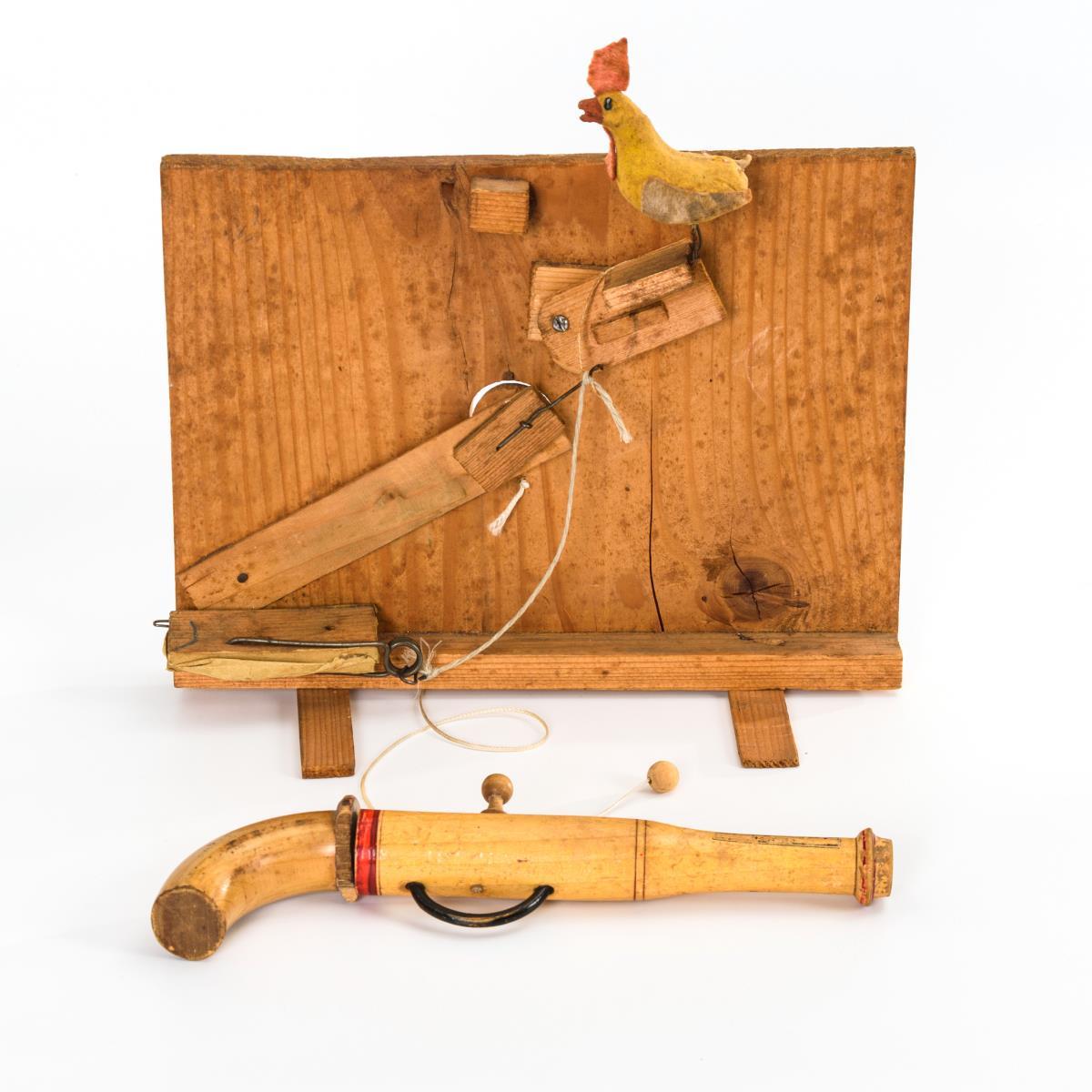 Stellwand mit Zielscheibe und Kugel, verso ein bewegliches Huhn mit Blasebalg. Dazu eine Holzpistole. Mechanismus defekt, Alters- und Gebrauchsspuren.
