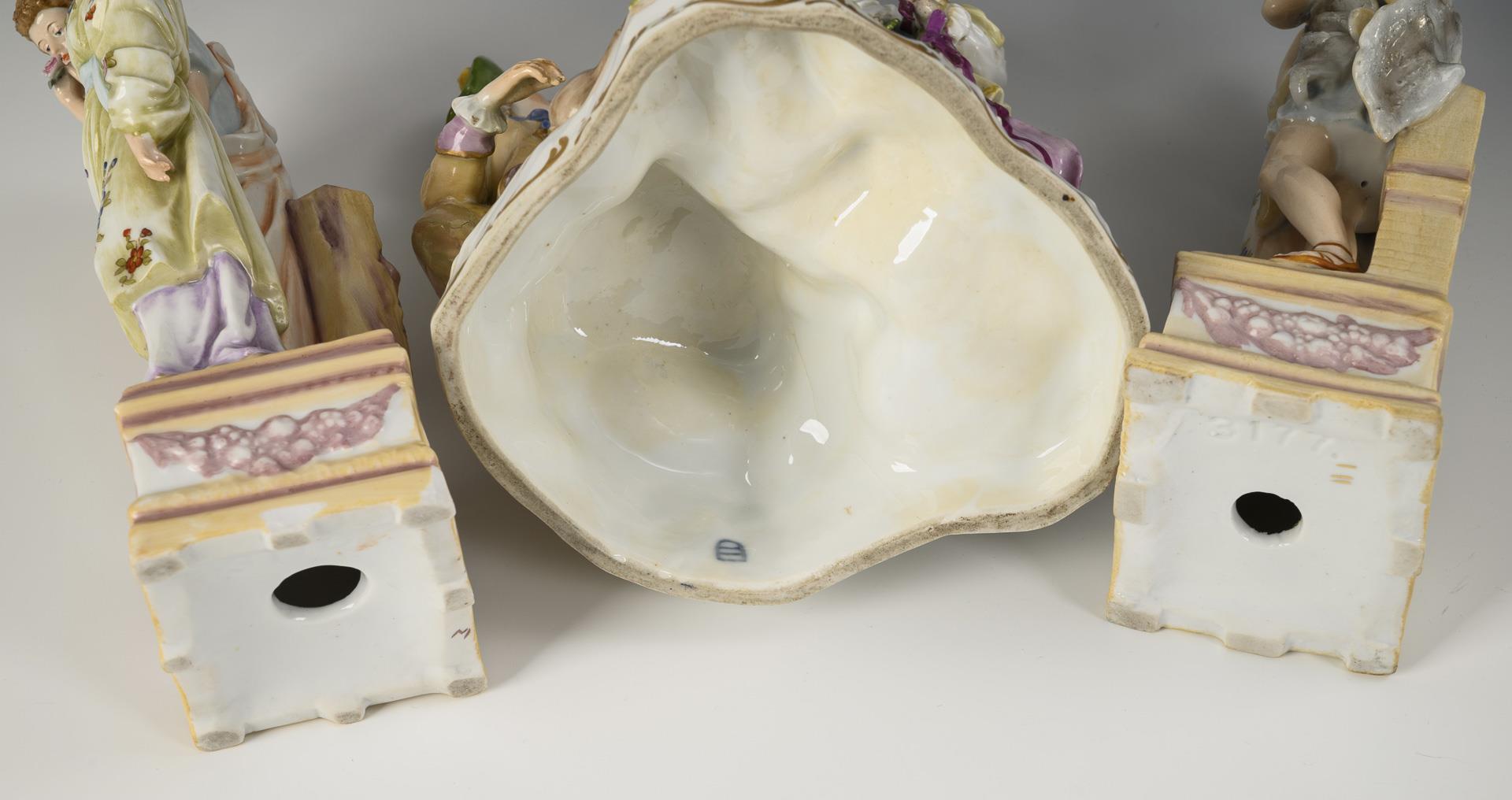 1x imitierte Bindenschildmarke: Gärtnerpaar auf einem Felssockel mit Blumentopf, Gießkanne und blütengefülltem Hut (H 22 cm). / 2x ungemarkt, Modell-Nr. 3176 und 3177: je ein antikisch gekleidetes Paar auf einem Podest (H 21 cm). Gärtnergruppe: Haarriss im linken Bein des Gärtners, Felssockel teils restauriert; Sockel eines Paares mit 2 Bestoßungen.