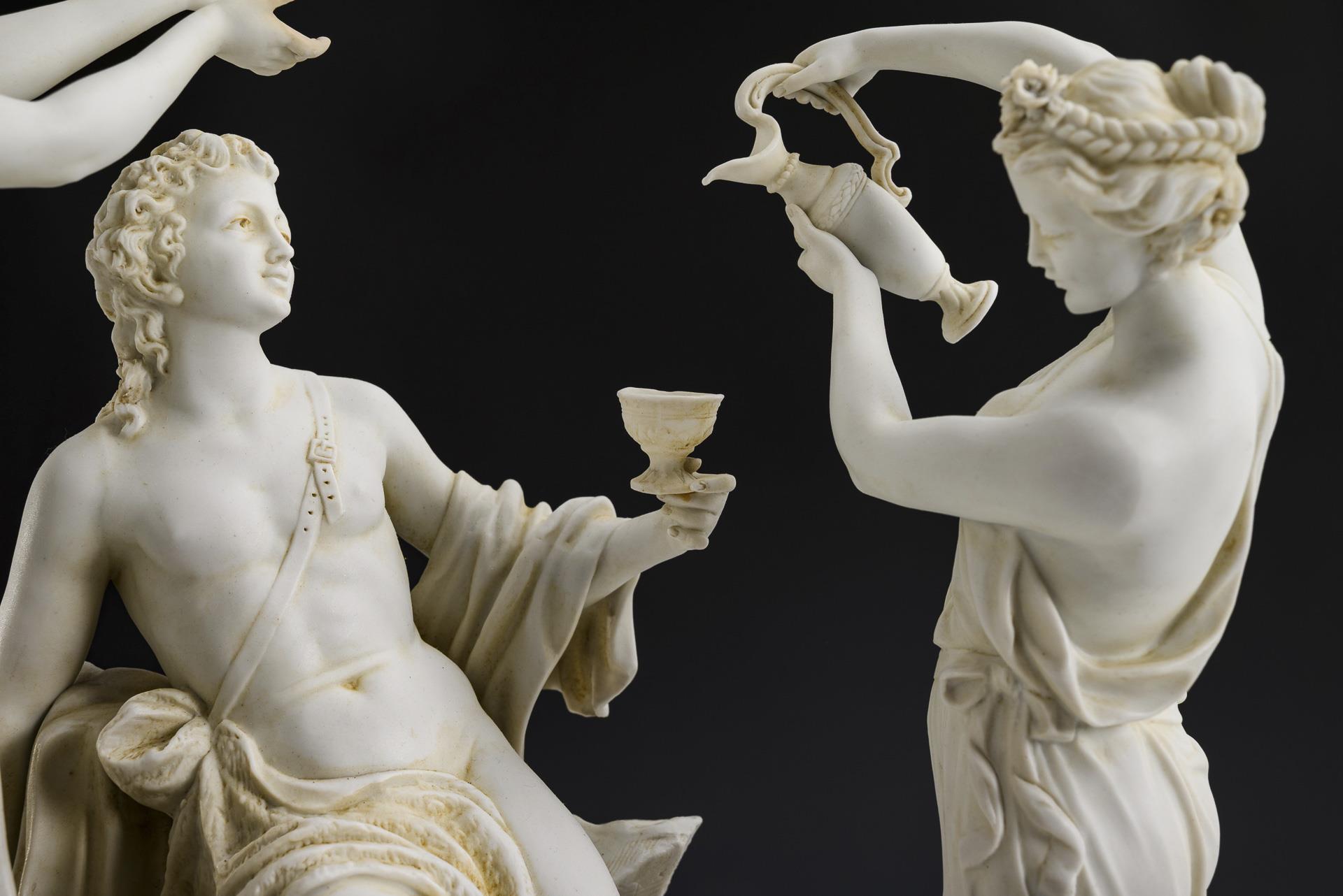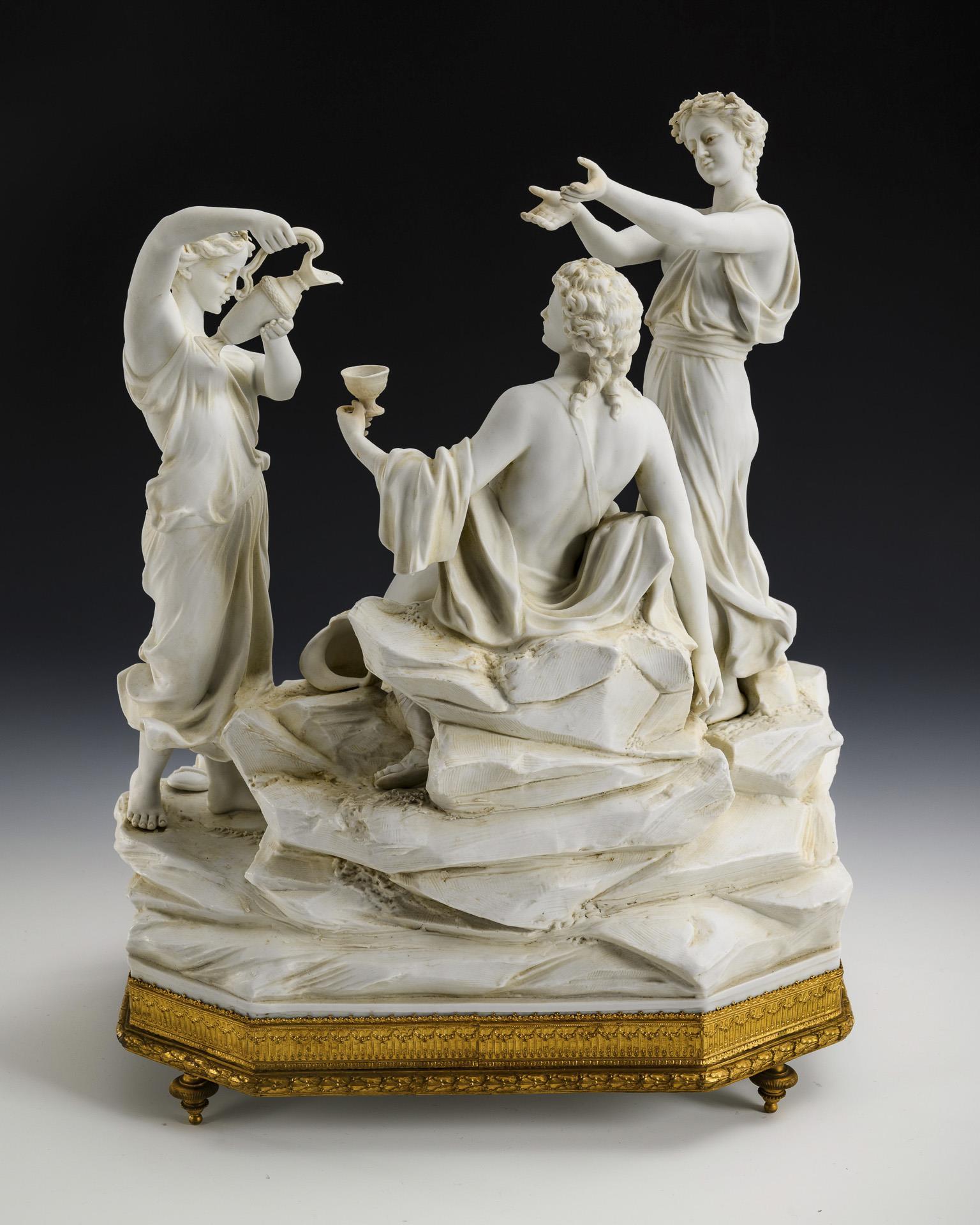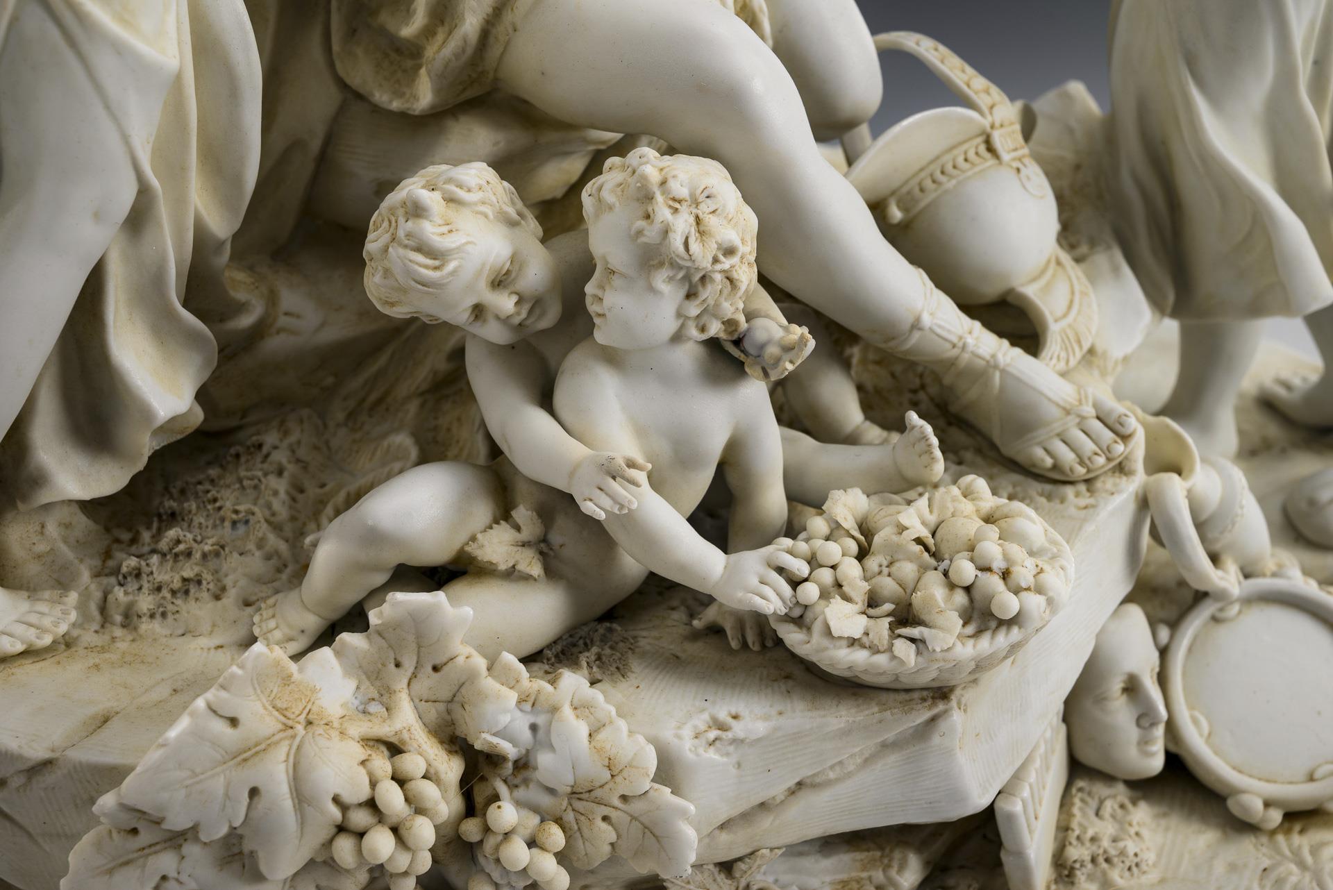Auf einem Felssockel sitzender, von zwei jungen Frauen begleiteter Bacchant, zu seinen Füßen zwei sich um einen Früchtekorb balgende Putten. Eingefasst in einen Bronzesockel mit vier Füßen. 3 Hände sowie 2 Puttenfinger restauriert, Blätter partiell bestoßen.