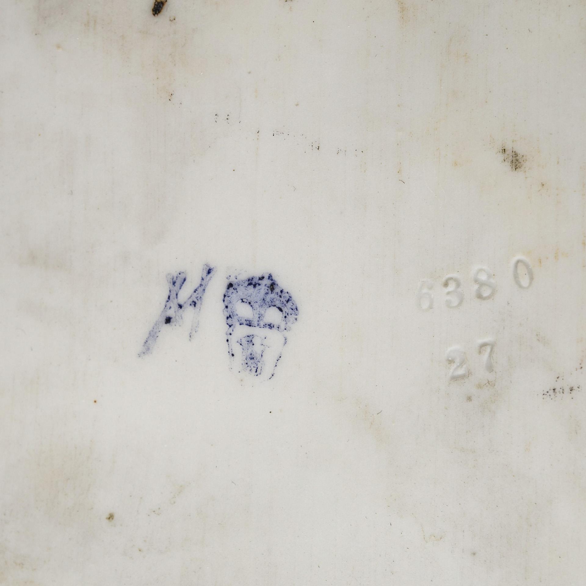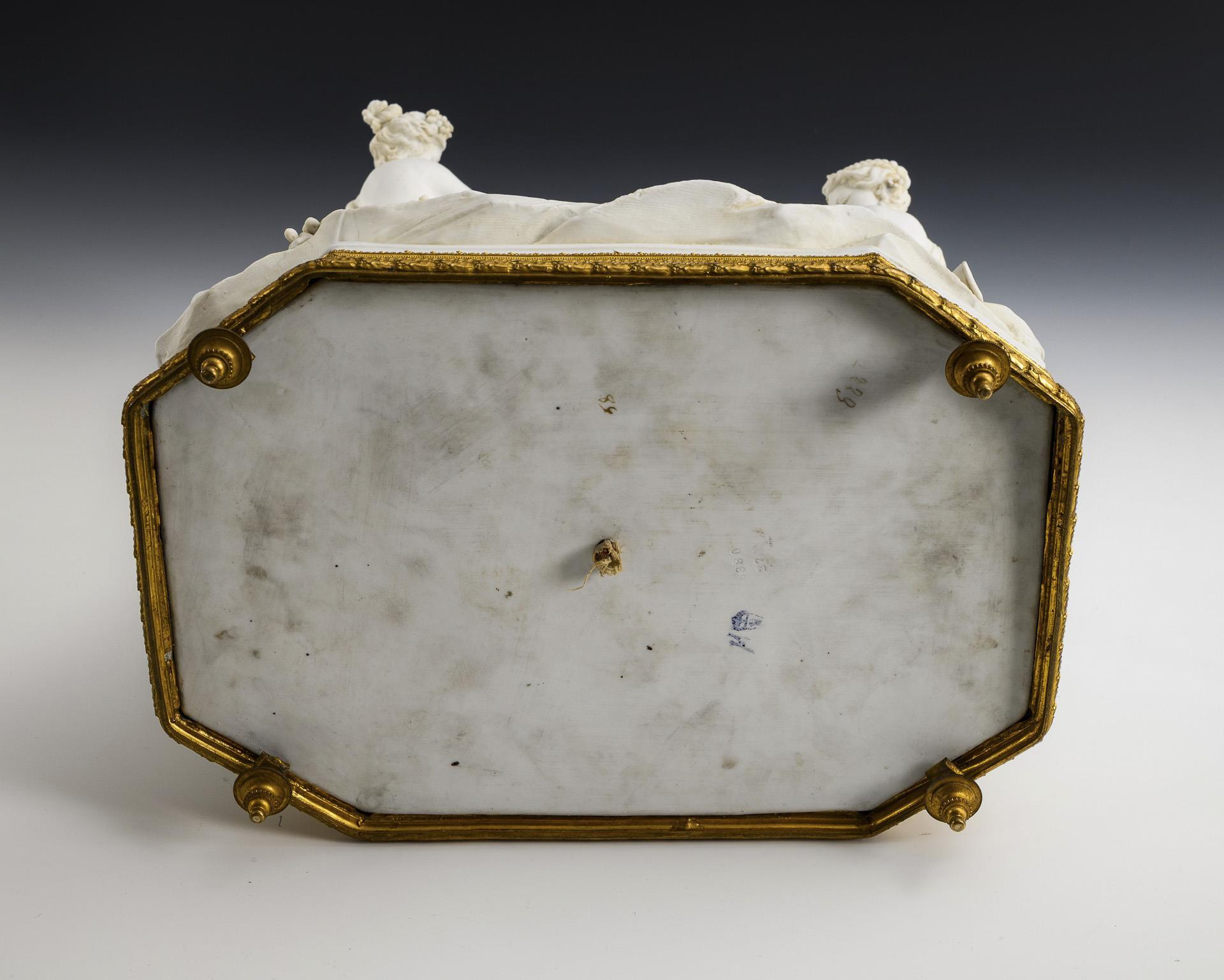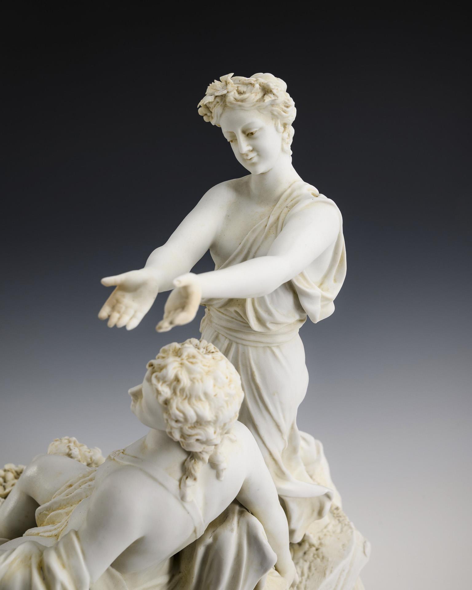 Auf einem Felssockel sitzender, von zwei jungen Frauen begleiteter Bacchant, zu seinen Füßen zwei sich um einen Früchtekorb balgende Putten. Eingefasst in einen Bronzesockel mit vier Füßen. 3 Hände sowie 2 Puttenfinger restauriert, Blätter partiell bestoßen.