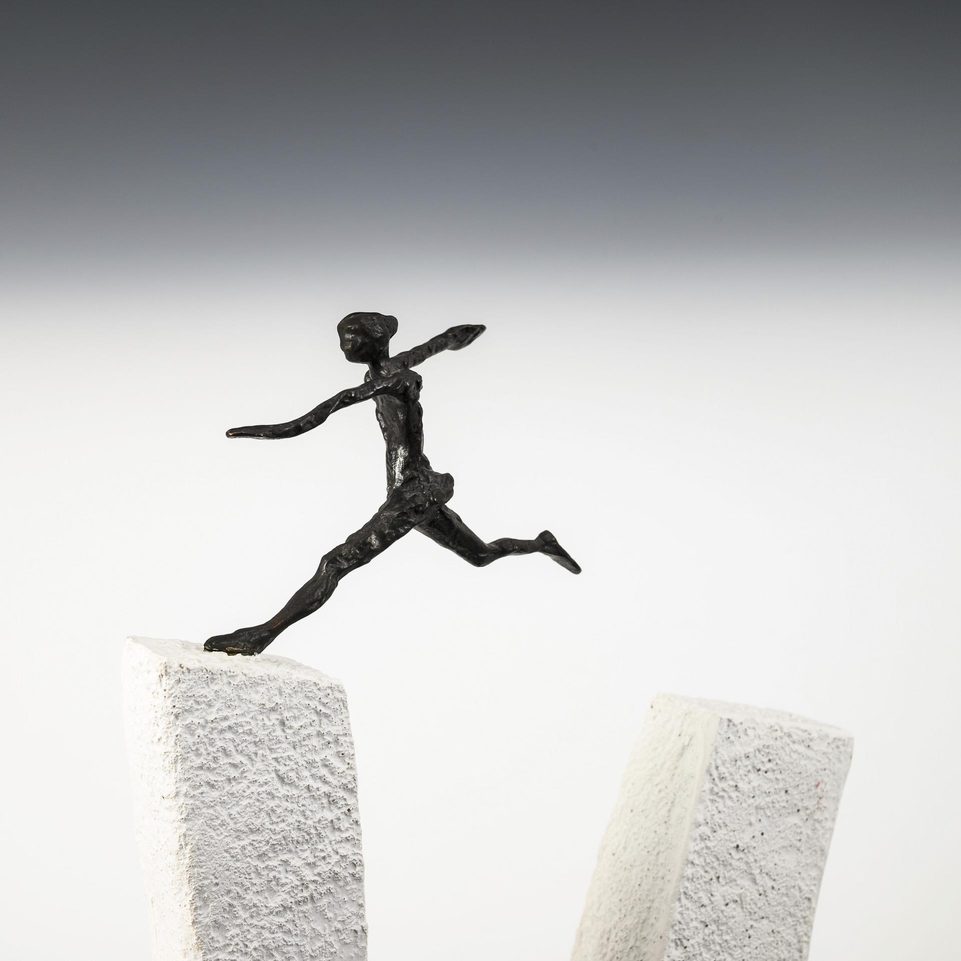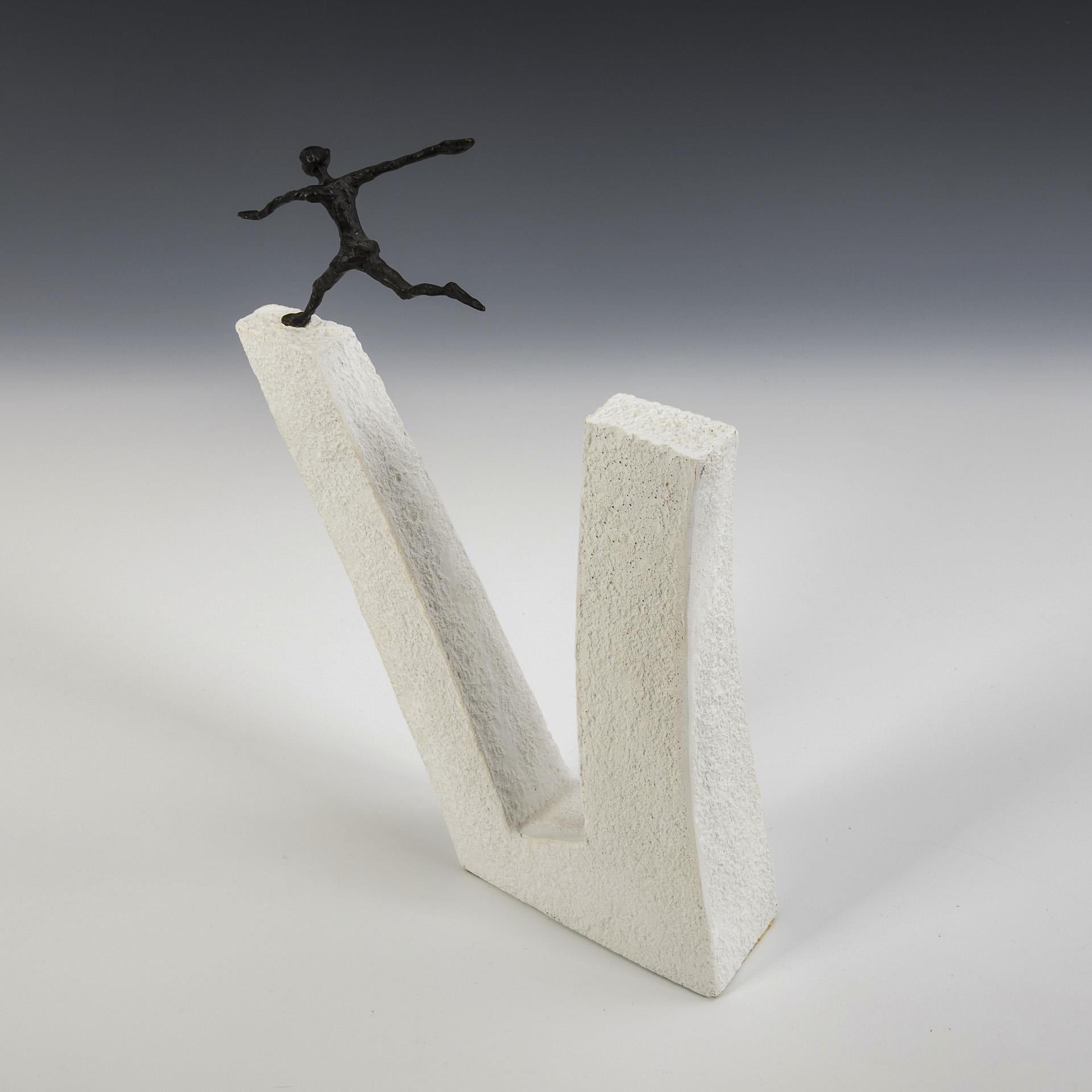 Moderne Skulptur mit einer bronzenen Läuferfigur auf einem V-förmigen weißen Element. Steinguss weist Gebrauchsspuren (Flecken) auf, Bronzefigur am Fuß angerissen und angeklebt.