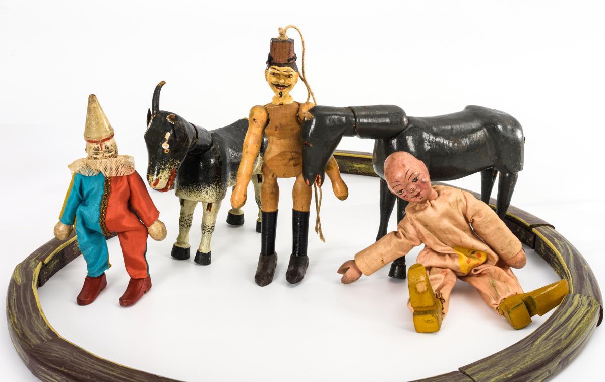 Teils original, teils thüringische Nachahmung aus der Zeit: 4 Figuren und 3 Tiere, 3 Becher und ein mehrteiliger Ring als Manege. Ziege und Esel original "Humpty Dumpty". Bespielt, teils Defekte und Fehlstellen.