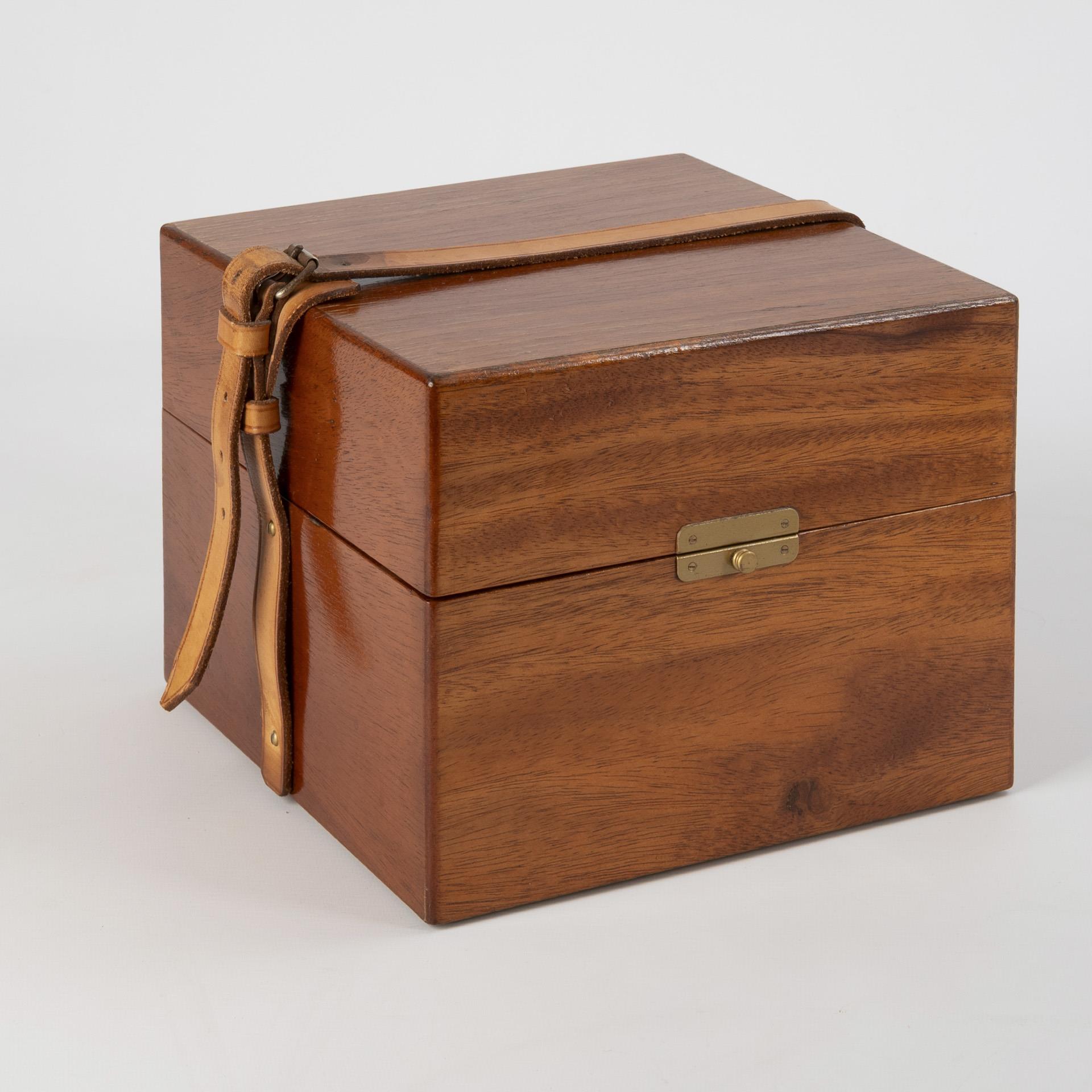Marine-Quarzchronometer in quadratischem Mahagoni-Uhrengehäuse mit verglastem Scharnierdeckel und seitlichen Messing-Tragegriffen. In Mahagoni-Transportkiste mit Ledergurt.