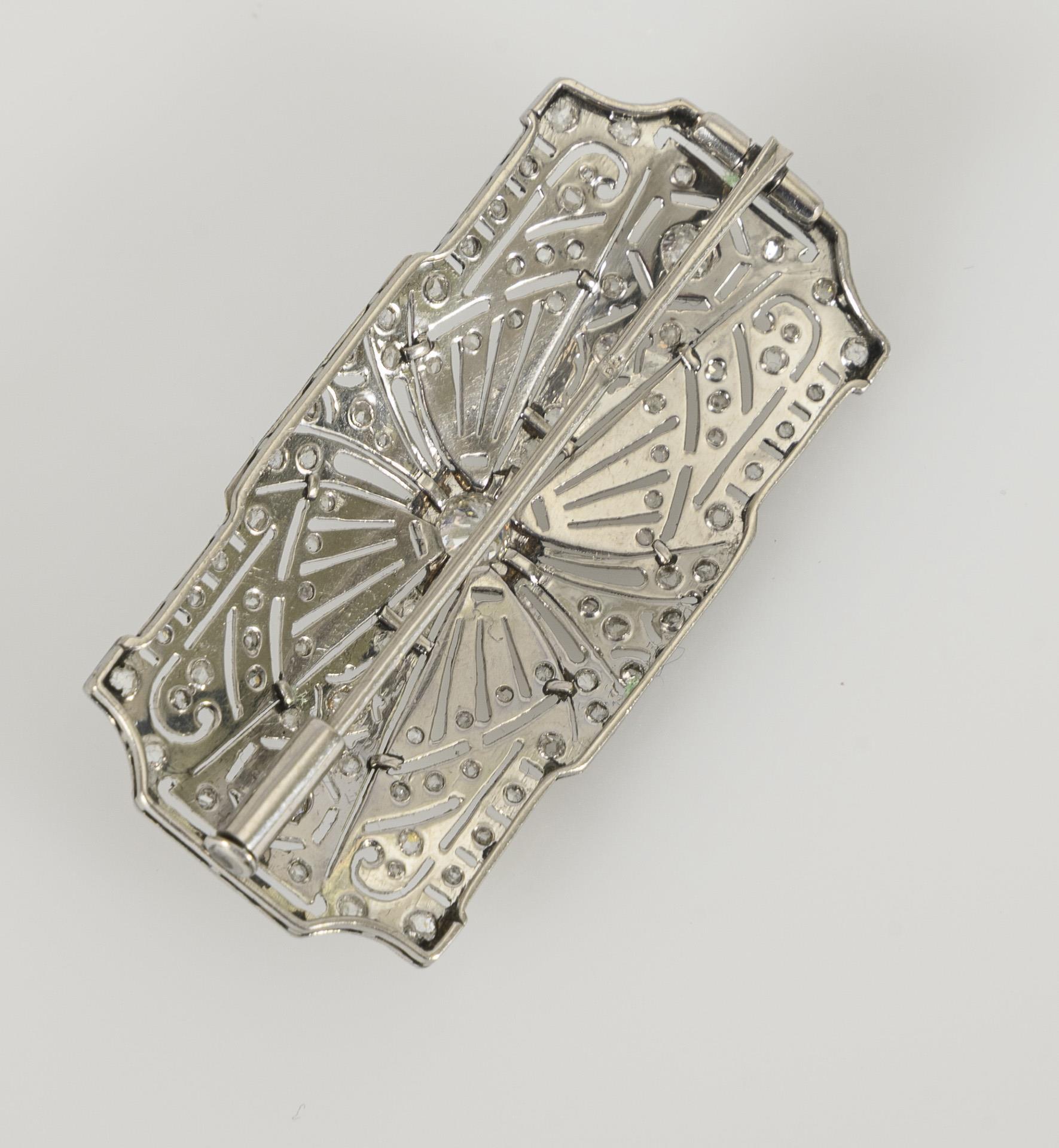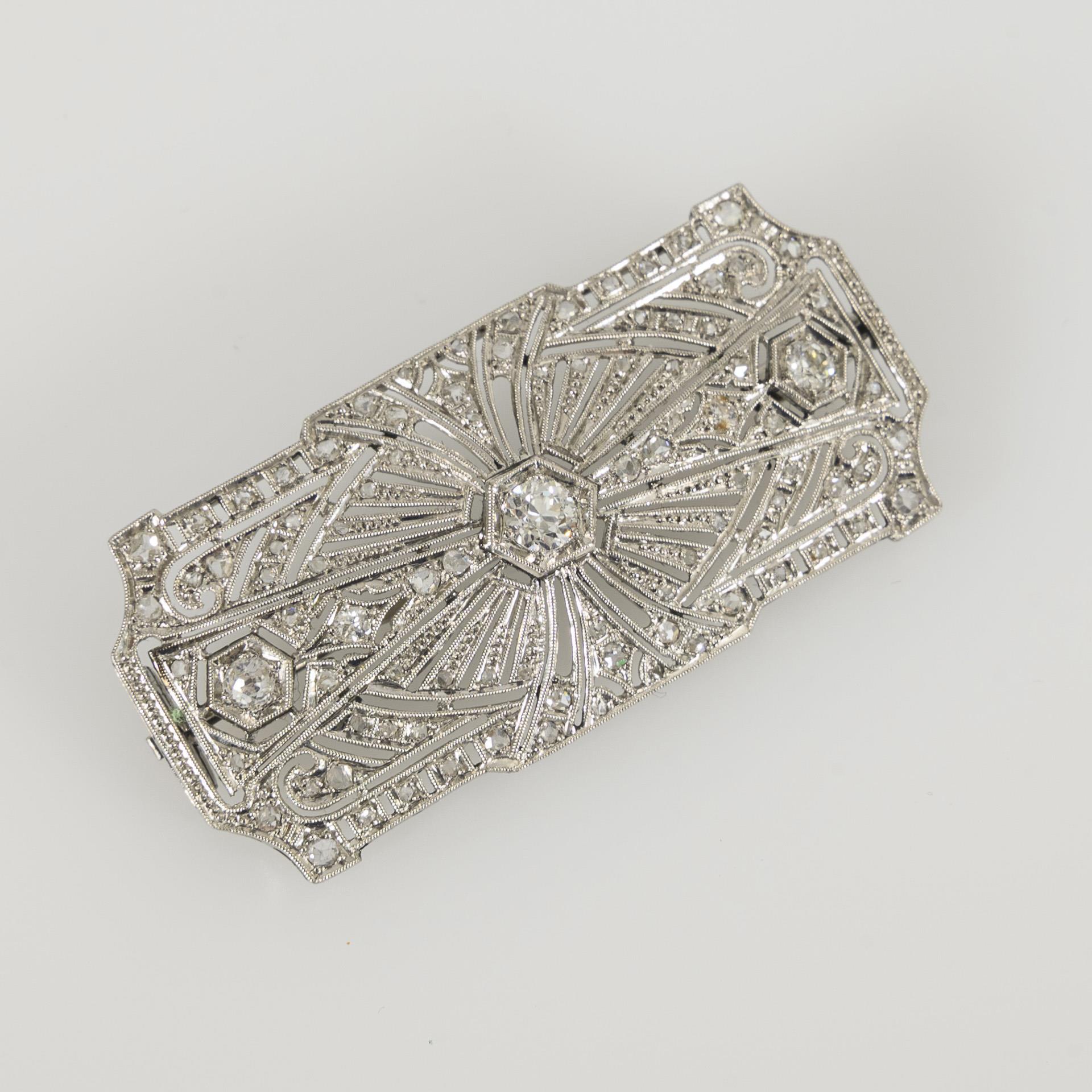 Brosche aus der Zeit des Art déco in geometrischer Ausgestaltung, besetzt mit 3 größeren Diamanten, 2 davon moderne Brillantschliffe, 1 Altschliffbrillant sowie zahlreichen kleinen Diamantrosen. Die Nadel mit Schiebesicherung.