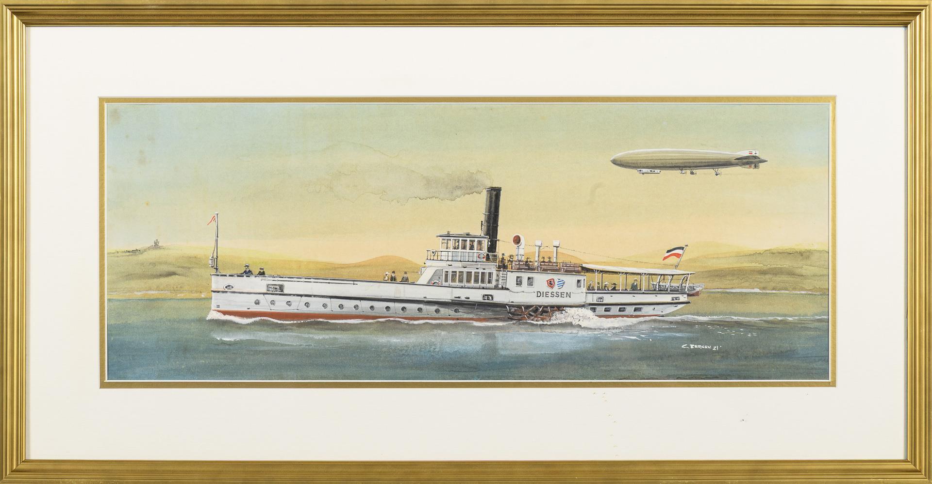Das Dampfschiff nahe der Küste mit einem vorüber fliegenden Zeppelin.