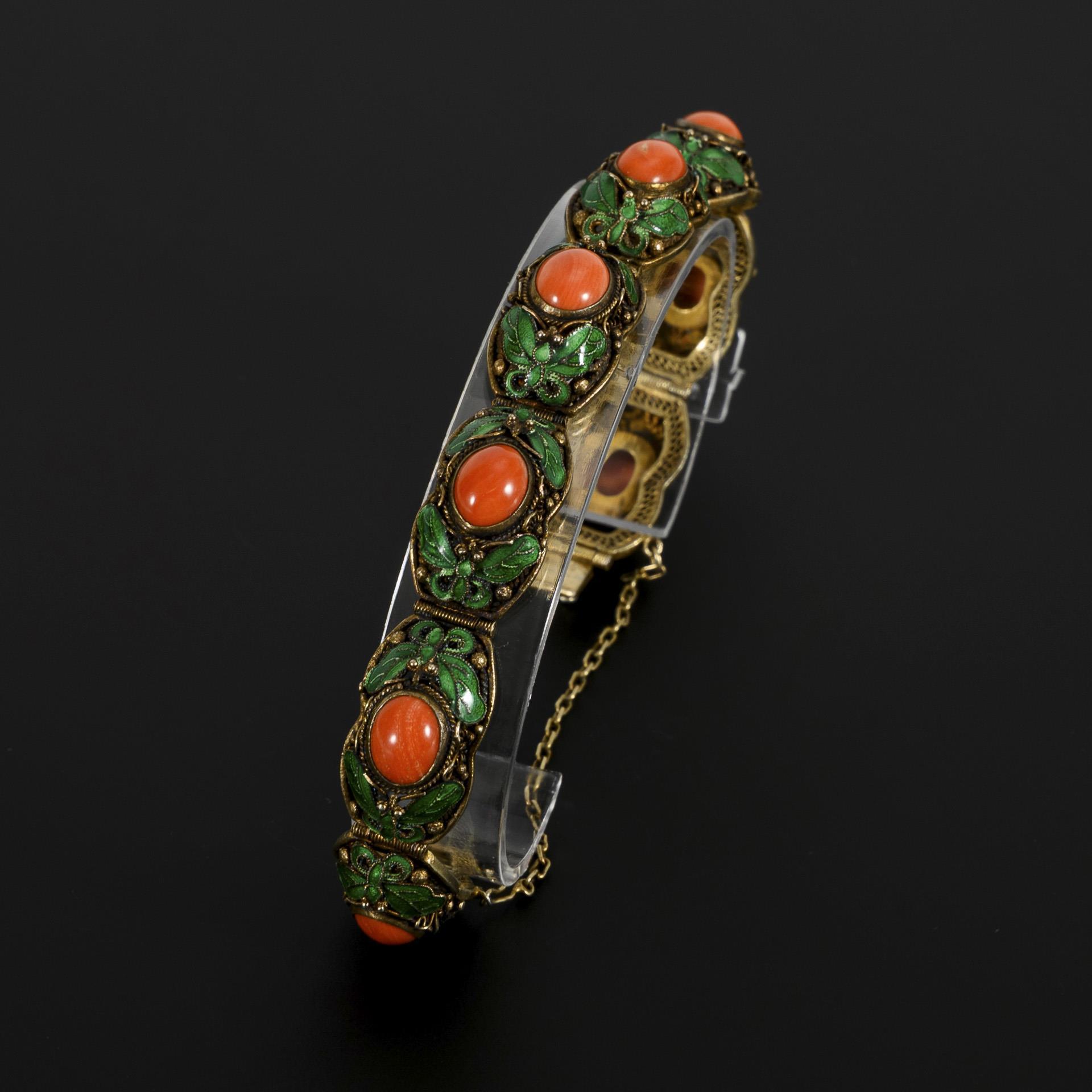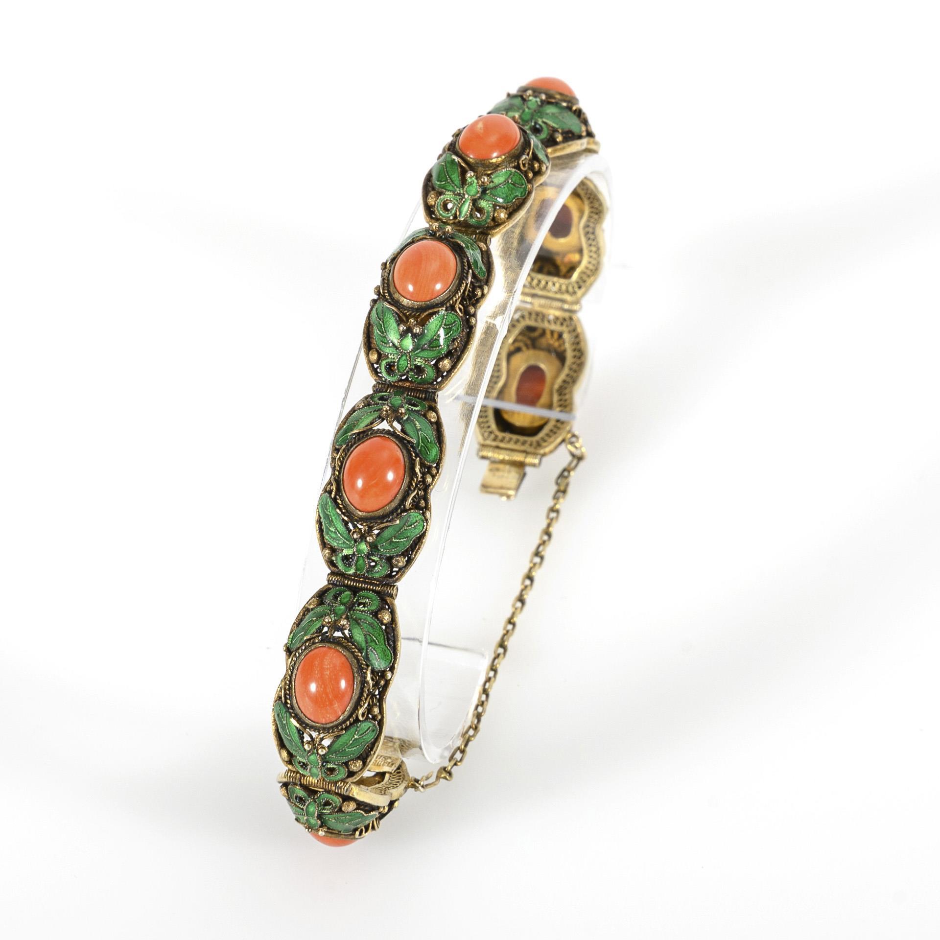 Chinesisches Armband mit Korallen-Cabochons und grünem Emaille.