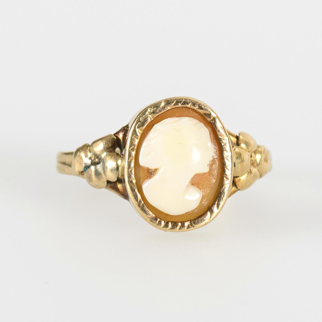 Zierlicher Ring mit ornamentierten Ringschultern, dazwischen zargengefasst eine Muschelkamee, einen nach rechts blickenden Frauenkopf im Profil zeigend. Eine Schulter mit Lötspuren, die Kamee berieben.