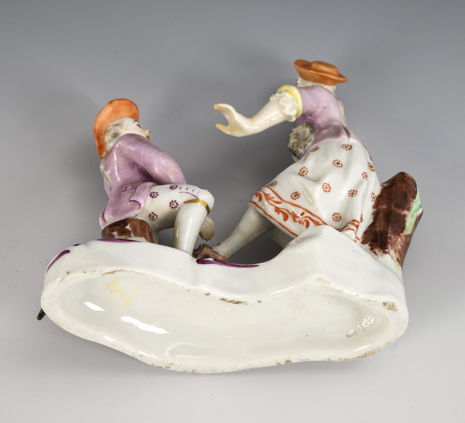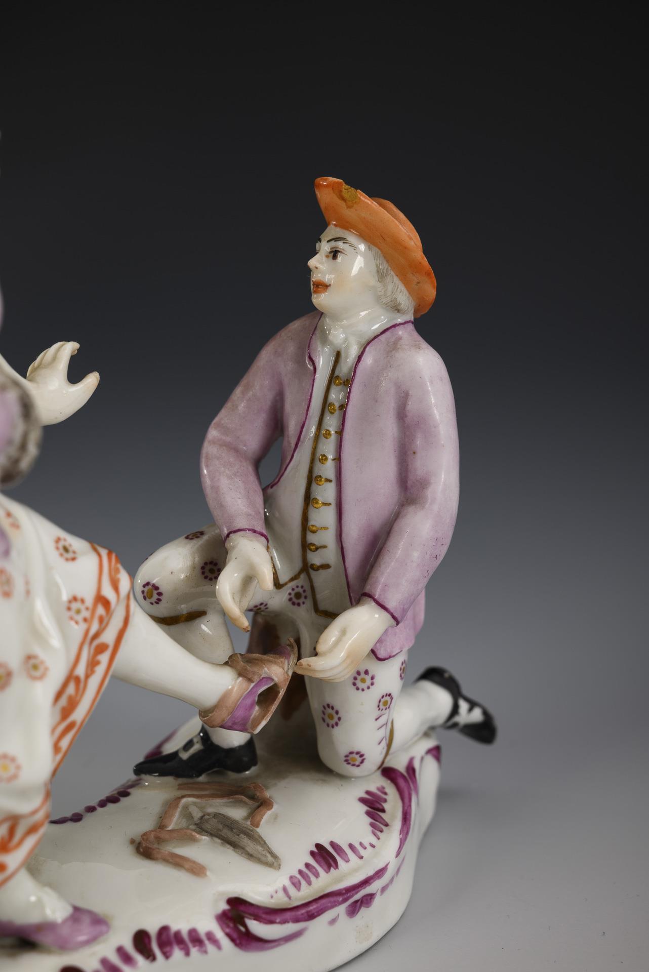 Einer Dame die Schlittschuhe anziehender, vor der Dame kniender Herr. Minimaler Chip am Hut des Herren.