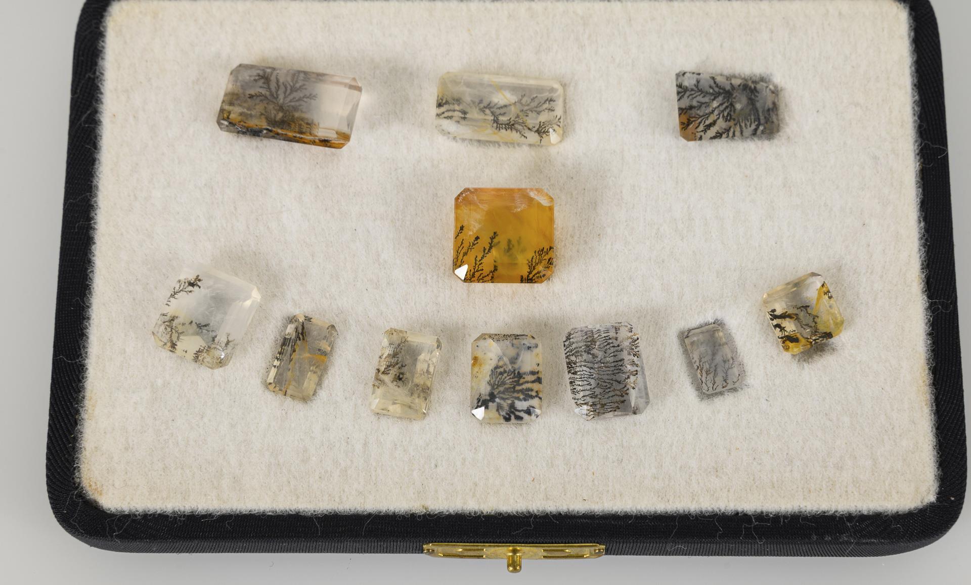 Alte Sammlungsschatulle mit insgesamt 11 Moosachaten in leicht changierender Farbe, verschiedenen Größen und Schliffen.