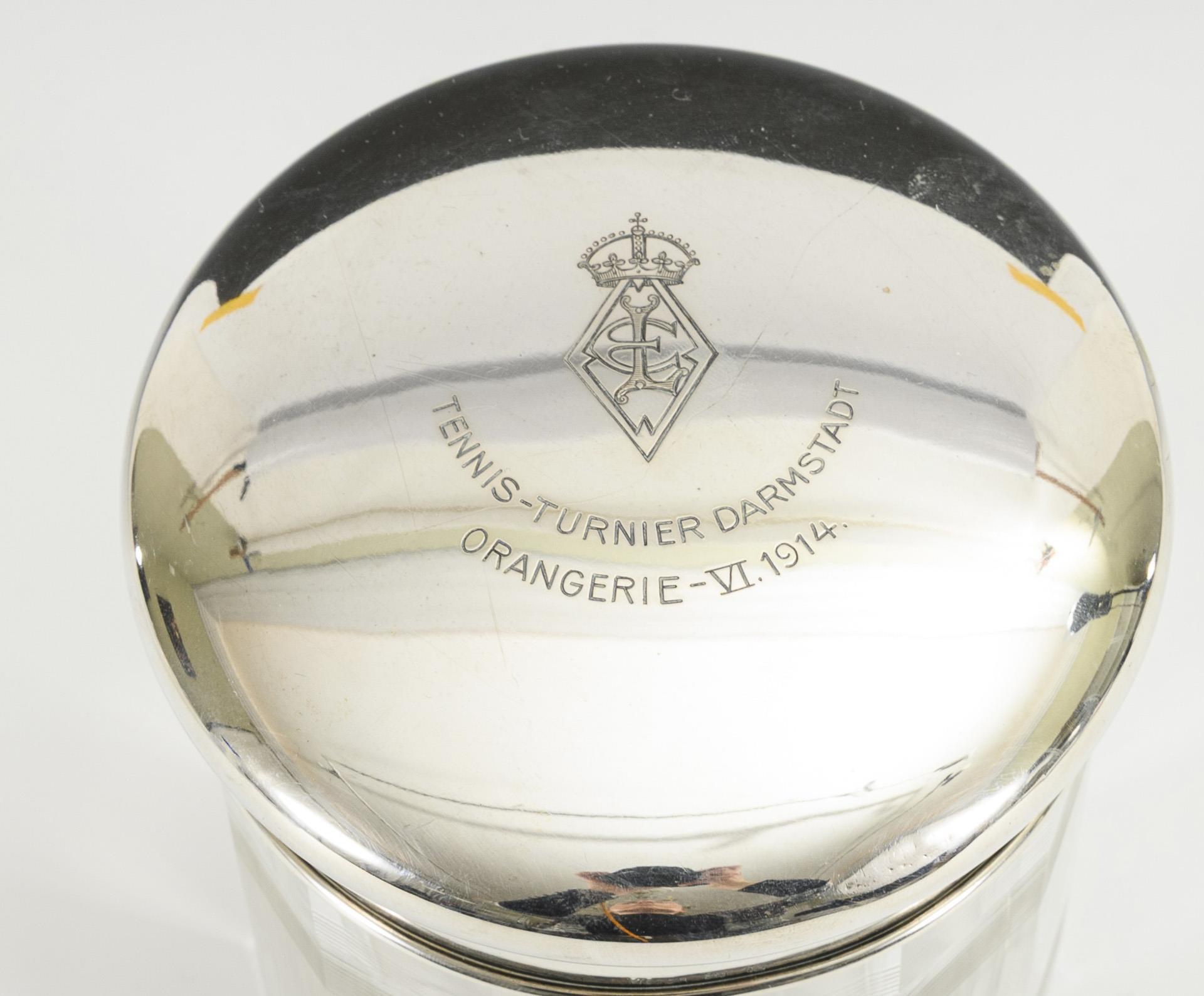 Facettiertes Glasgefäß mit Silberdeckel, mit Preisgravur: "Tennis-Turnier Darmstadt, Orangerie - VI. 1914", mit bekröntem Monogramm von Großherzog Ernst Ludwig. Kleine Chips am Glas, Deckel minimal gedellt.
