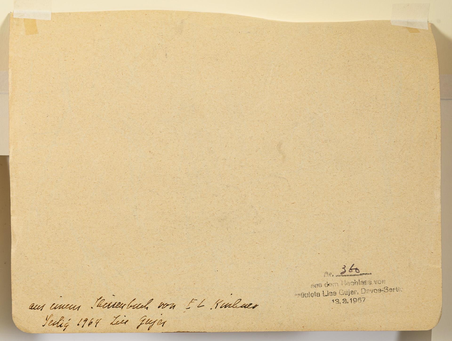 Rückseitig auf dem Blatt handschriftlicher Vermerk: "aus einem Skizzenbuch von E L Kirchner Sertig 1964 Lise Gujer", dazu Stempel: "Nr. 360 aus dem Nachlass von Fräulein Lise Gujer, Davos-Sertig 13.3.1967".