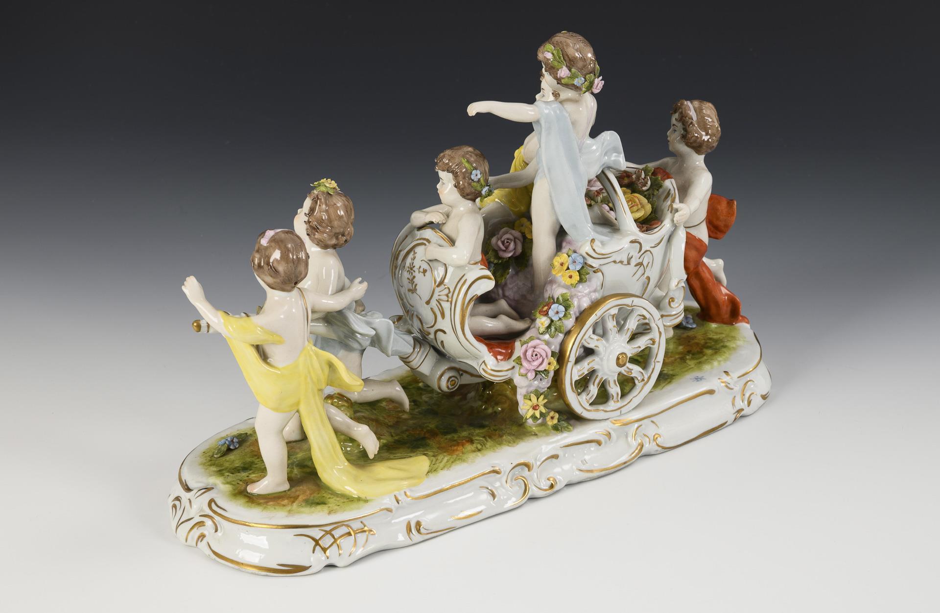 Sechsfigurige Gruppe von auf der Kutsche sitzenden sowie diese ziehenden Putten.