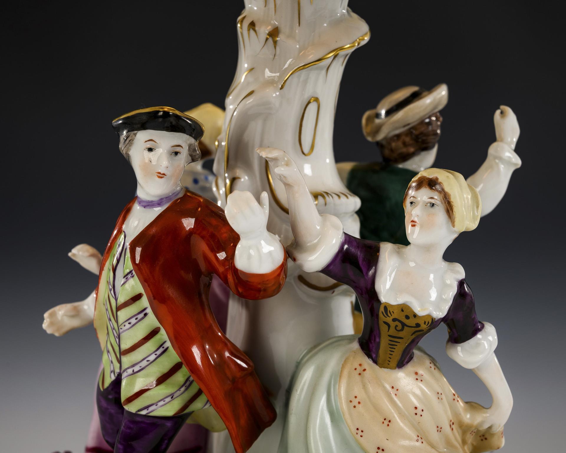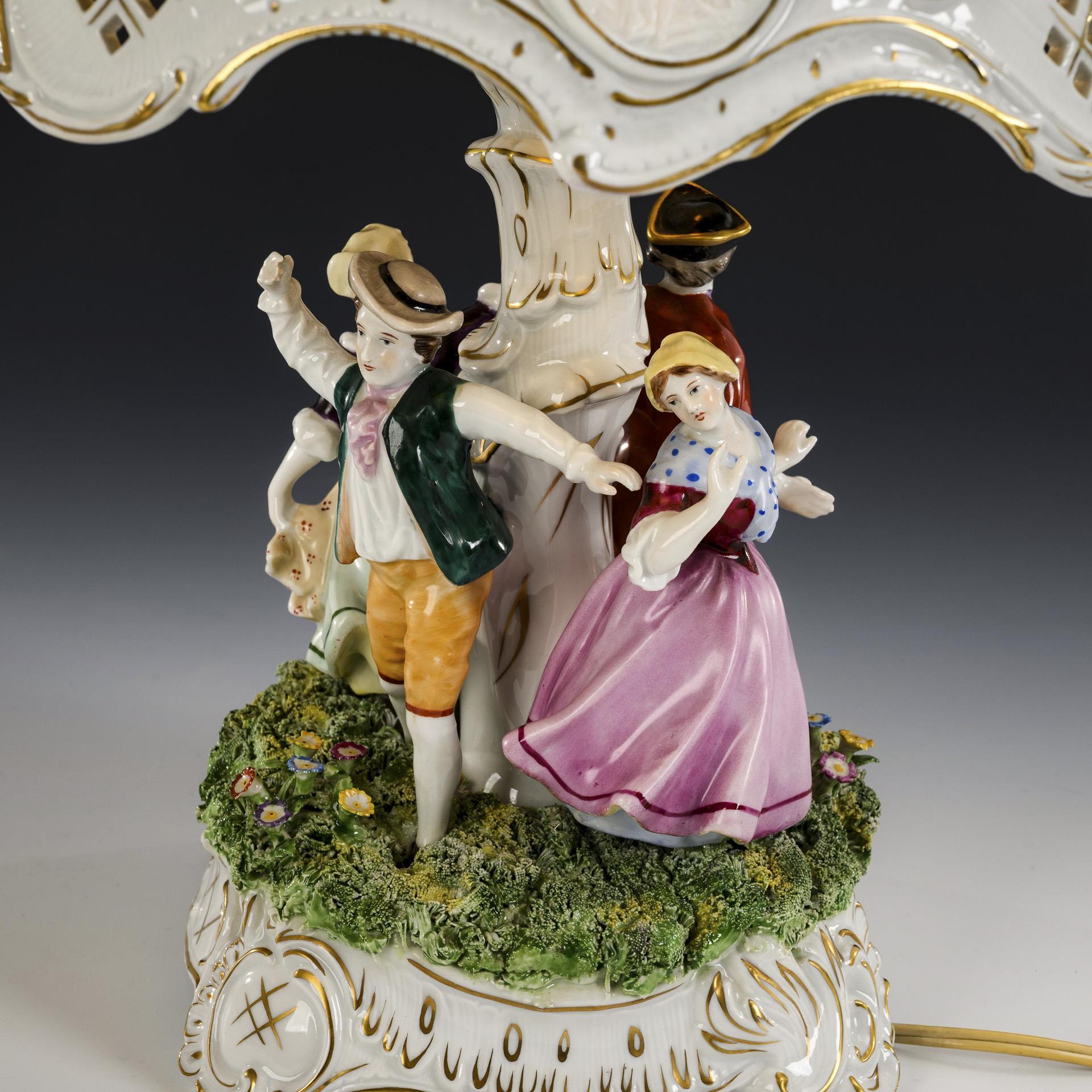 Zwei um einen Baumstamm als Schaft tanzende Paare, rocaillereliefierter, blütenbelegter Lampenschirm mit 4 Lithophaniebildern. Alt elektrifiziert.