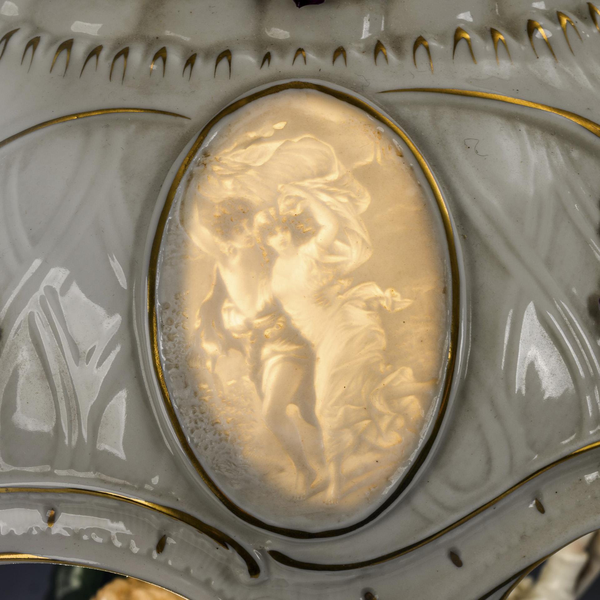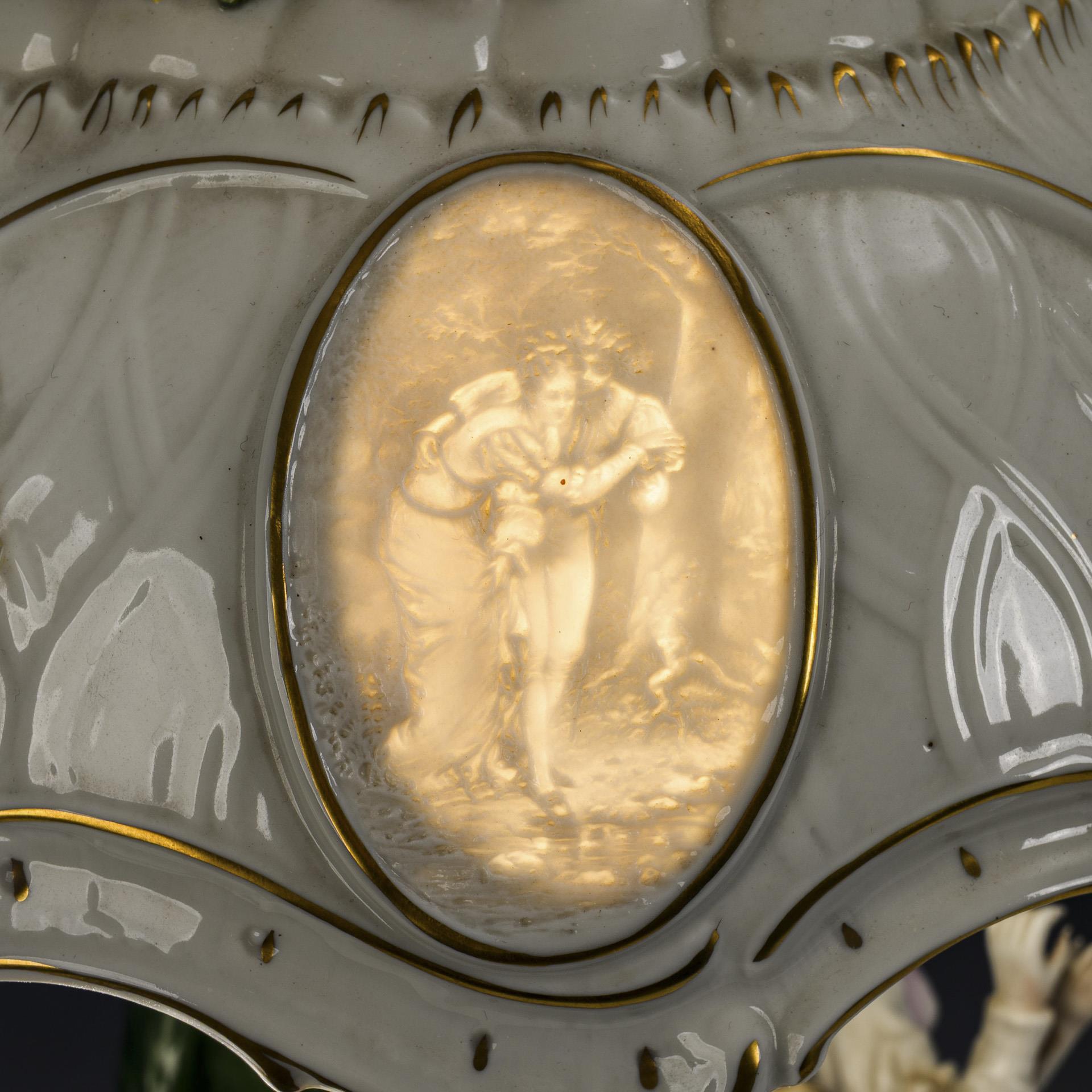 Zwei um einen Baumstamm als Schaft tanzende Paare, rocaillereliefierter, blütenbelegter Lampenschirm mit 4 Lithophaniebildern. Alt Elektrifiziert. Minimale Bestoßungen am Belag, Elektrifizierung erneuerungsbedürftig.