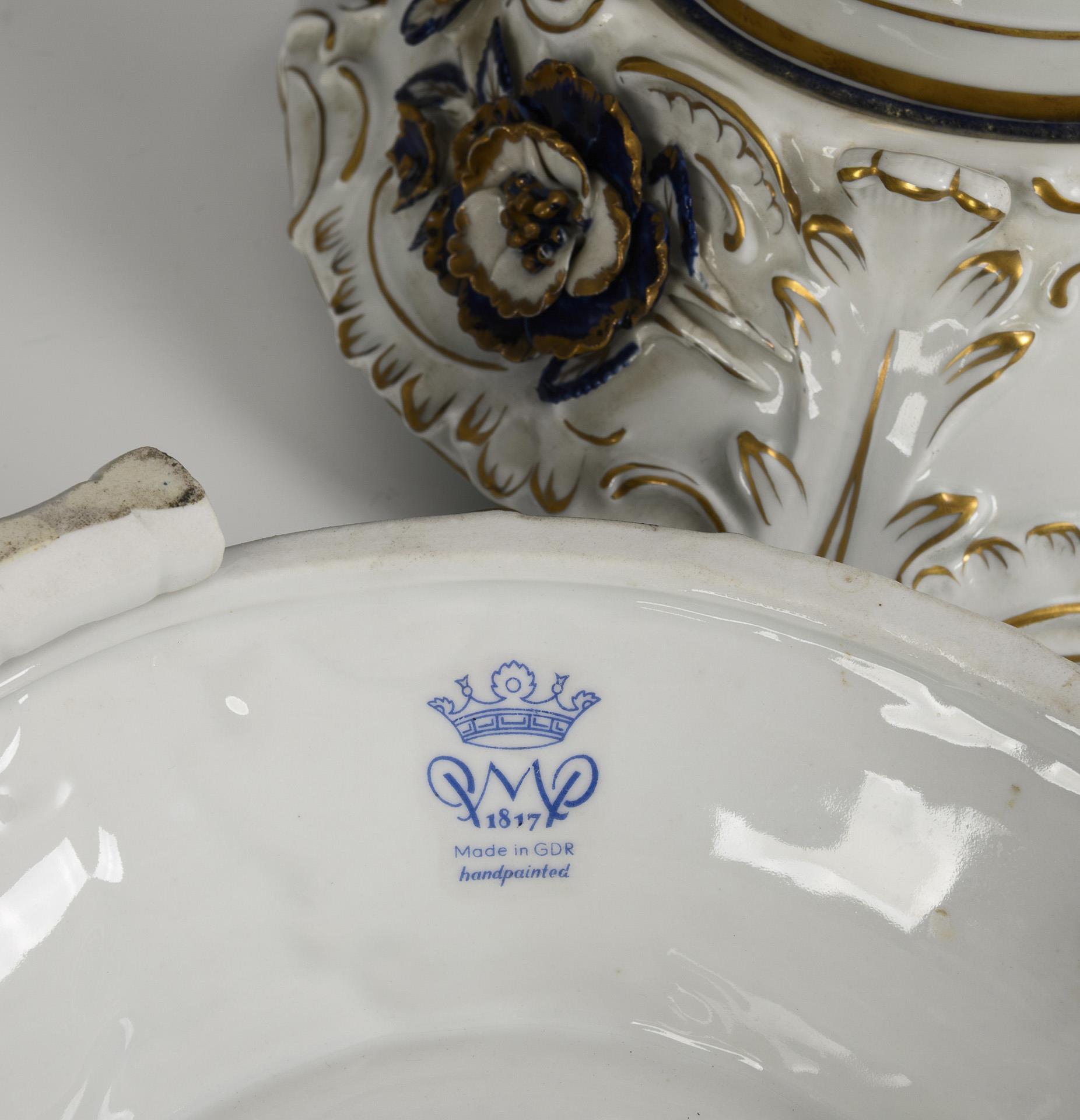Unterglasurblaue Malerei, Goldstaffage. H gesamt 61 cm.