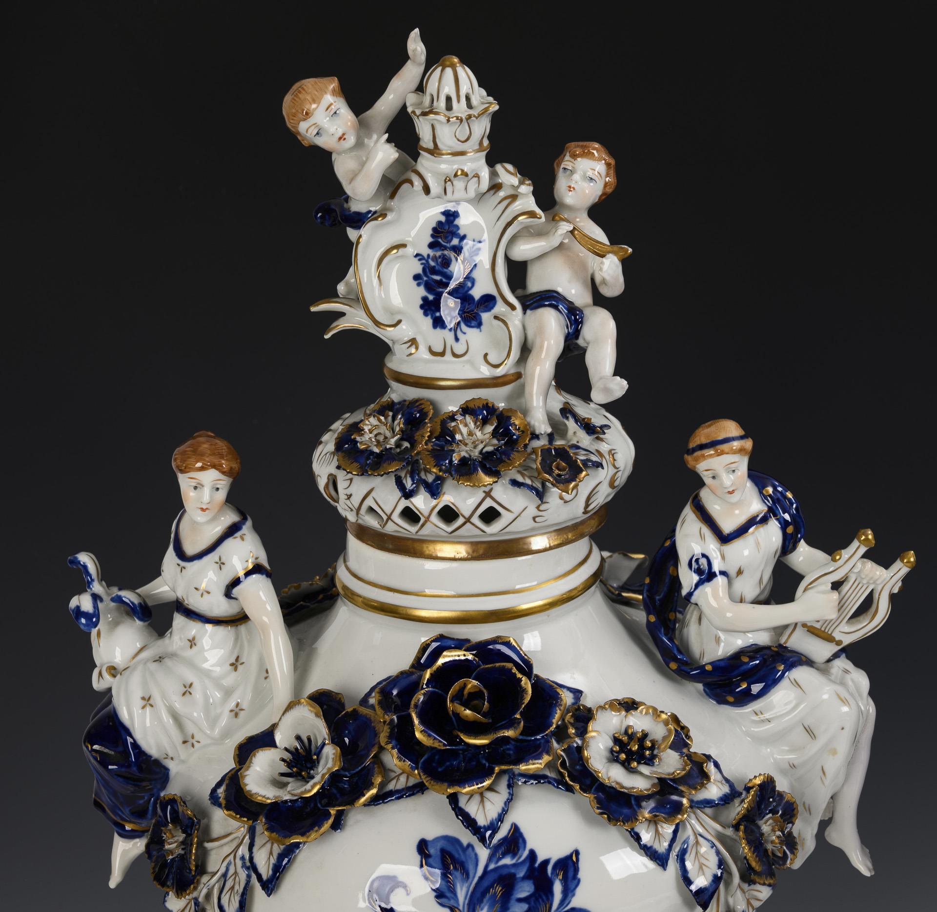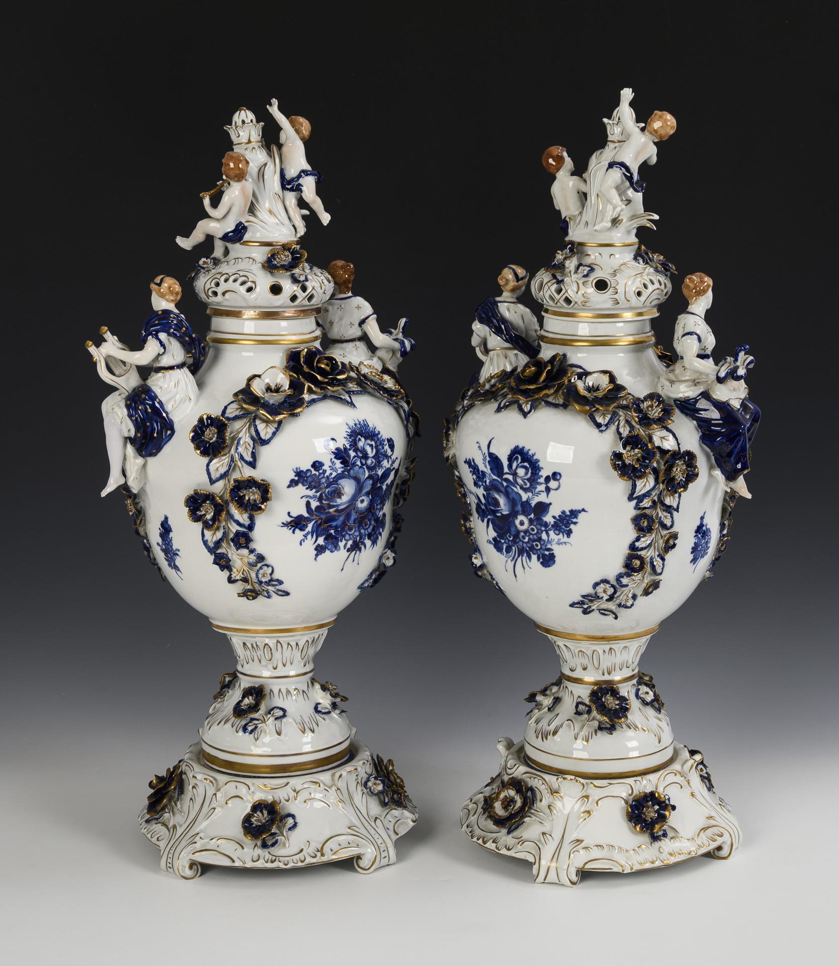 Reich mit Blüten belegte Balustervasen mit zwei auf der Schulter sitzenden Musen mit Lyra bzw. Helm, durchbrochener Deckel mit zwei an einem wappenartigen Schild sitzenden Putten, blaue Blumenmalerei, Auf rundem Sockel mit Blütenbelag und vier Füßen. Minimale Bestoßungen am Belag.