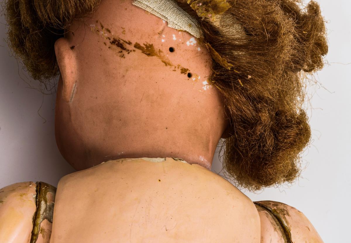 Kurbelkopf, blaue Schlafaugen, offene Nasenlöcher, offener Mund mit 2 Zähnchen, Kunsthaarperücke. 5-teiliger Sitzbabykörper. Unbekleidet. Kopf nicht durchleuchtet, Perücke fest. Armansätze geklebt, kleiner Finger links fehlt.