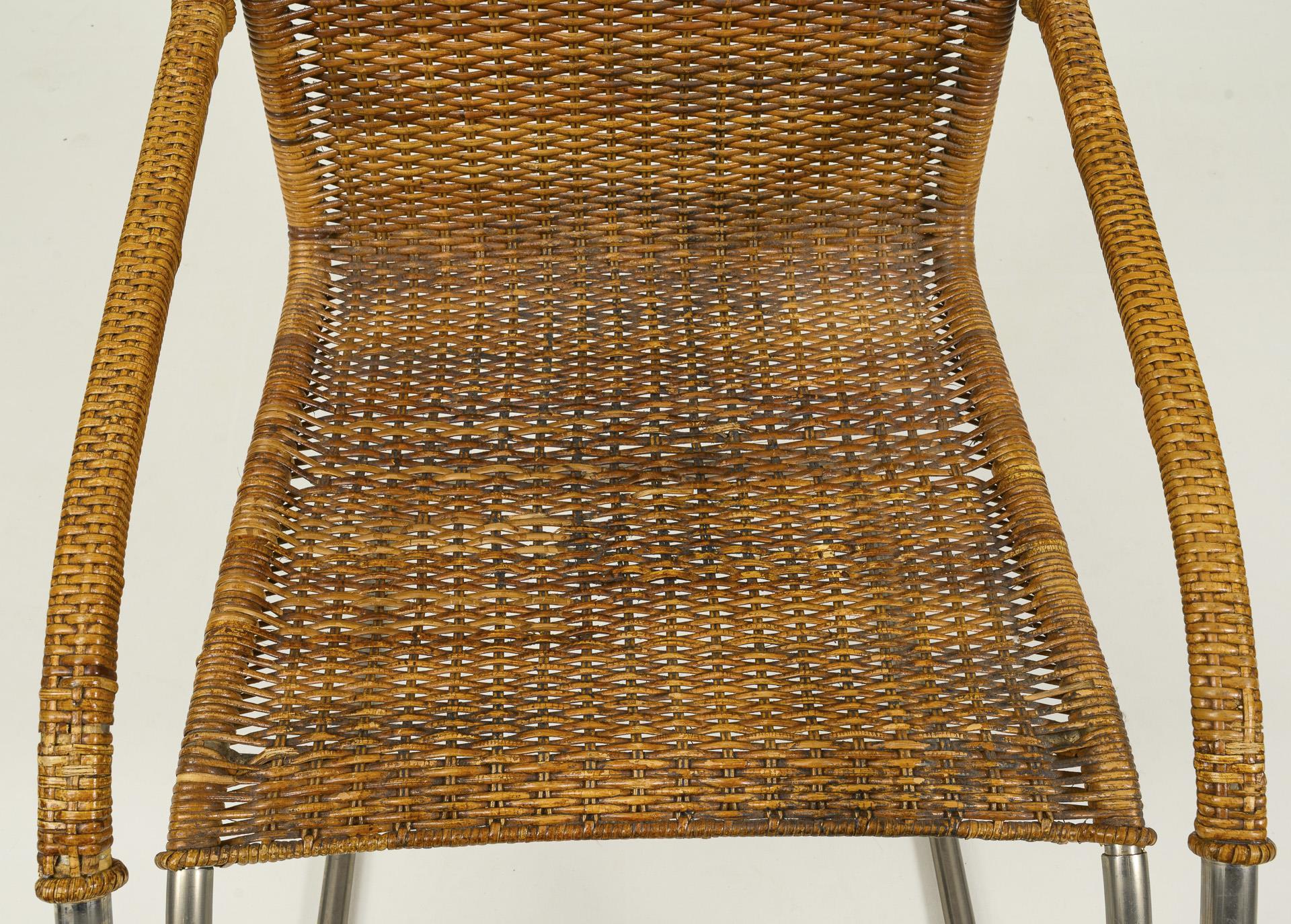 Federnder Freischwinger in fließender Form mit "schwebender" Sitzfläche und seitlich gerundeten Armstützen, Rückenlehne und Sitzfläche aus durchgehender Korbgeflechtbespannung. Leichte Alters- und Gebrauchsspuren, partiell kleine Defekte am Geflecht.