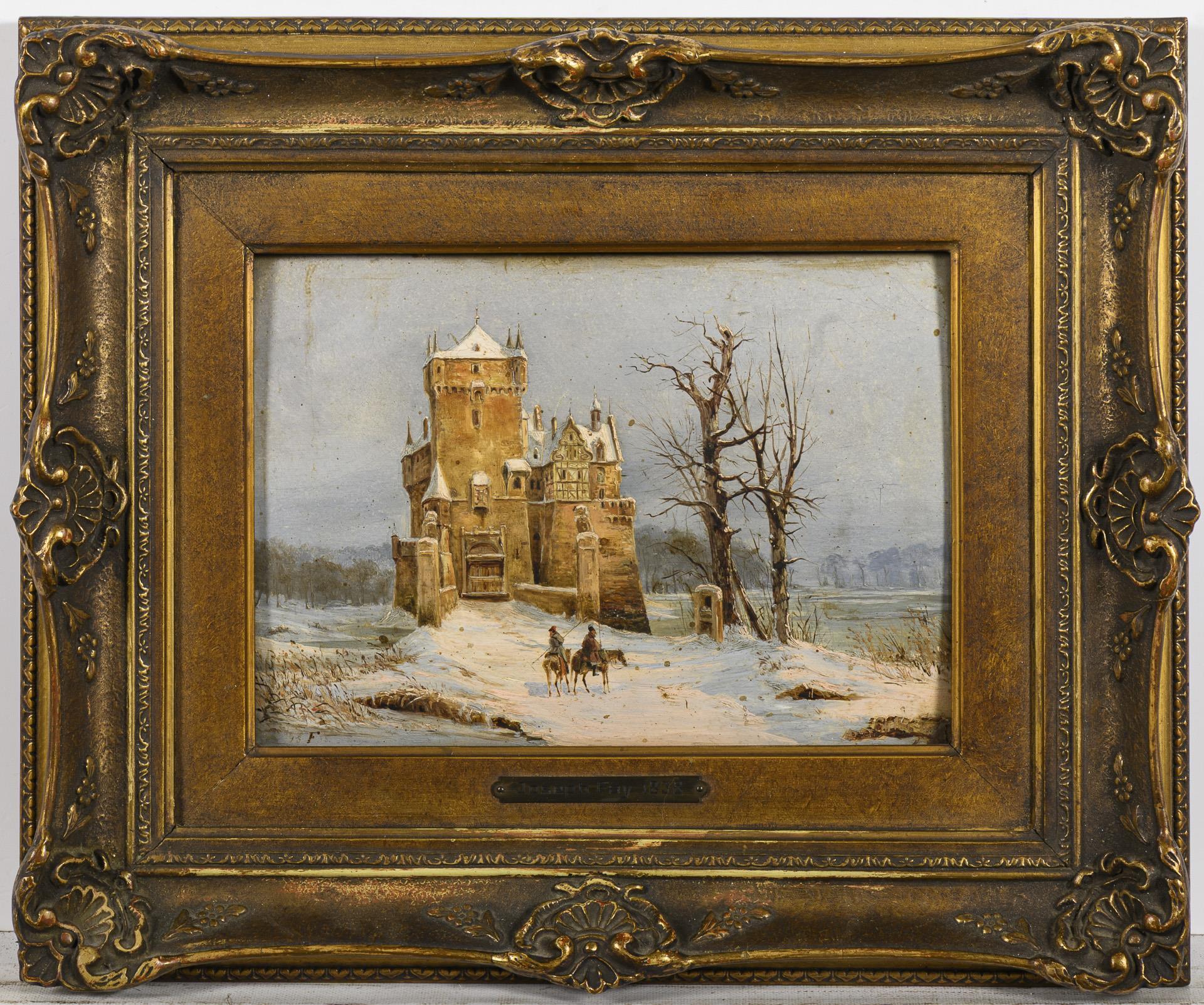 Zwei Reiter im Schnee vor einer Burg an einem gefrorenen See im Sonnenschein. Leichte Altersspuren.