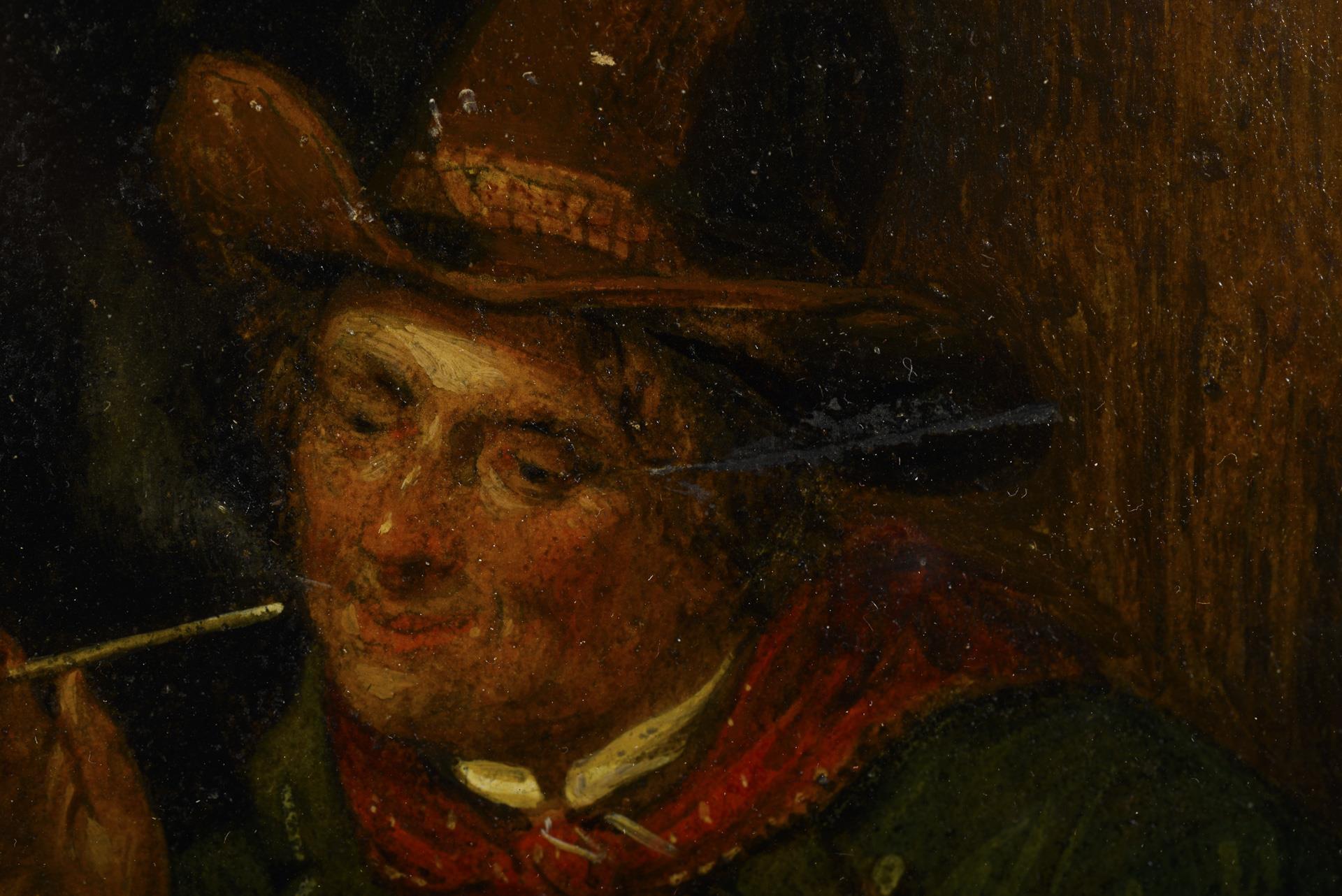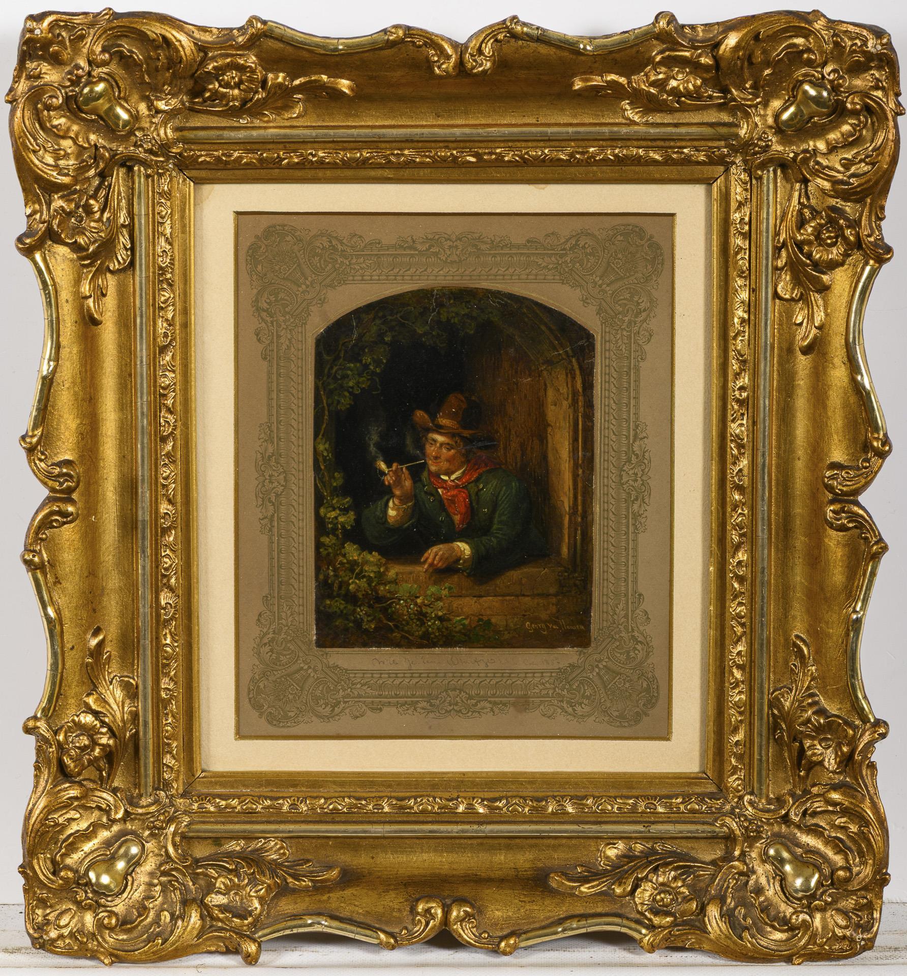 Bildnis eines Mannes in einer von Wein umrankten Fensternische beim Rauchen der Pfeife. Retuschiert.