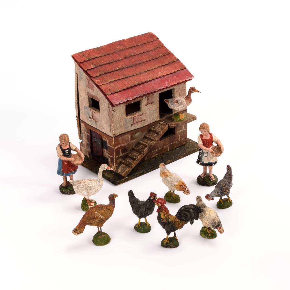 Hühnerstall aus Holz, mit rückseitiger Klappe. Dazu 2 Bäuerinnen und 8x Geflügel. Altersspuren, kleine Defekte.